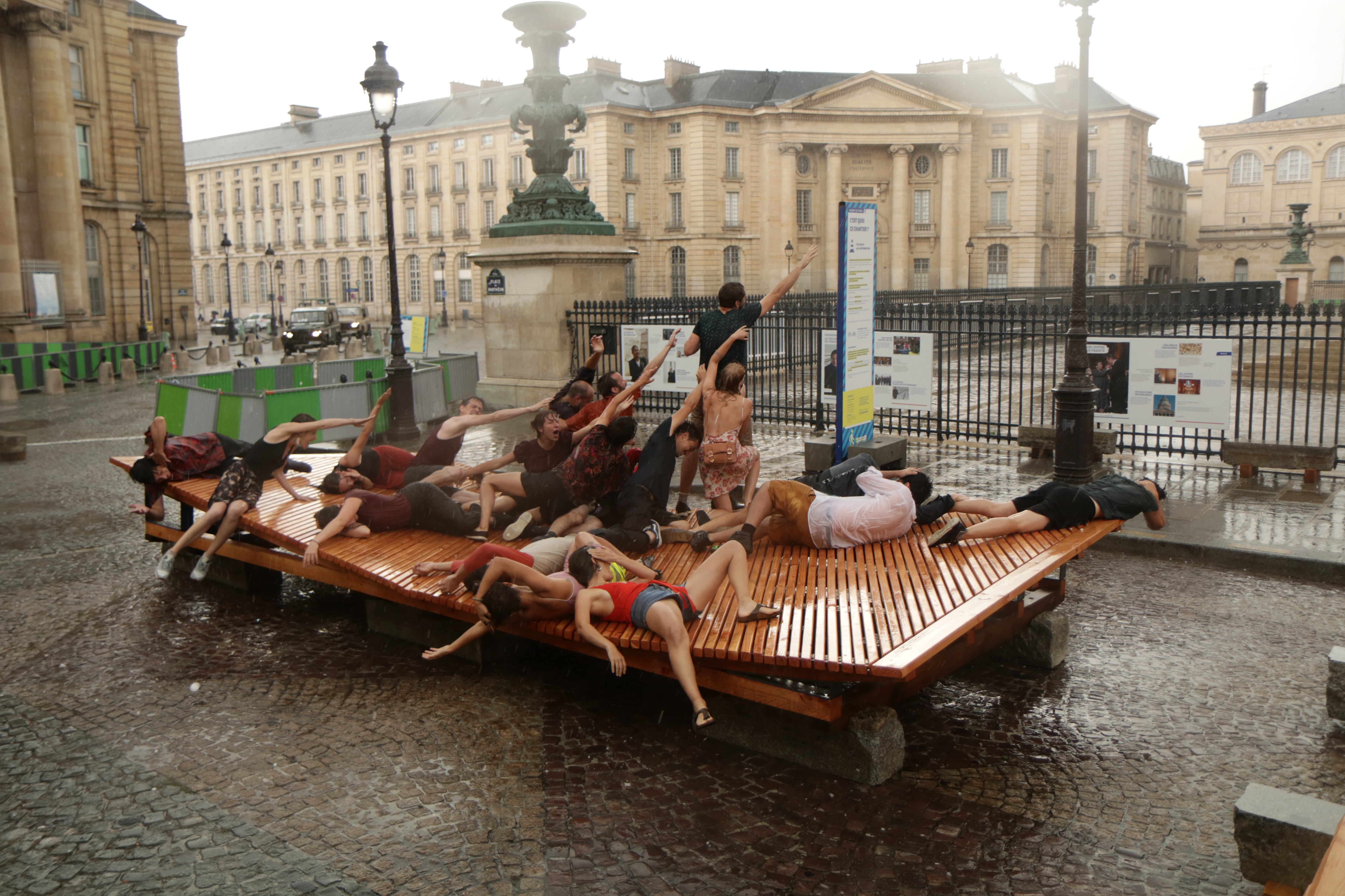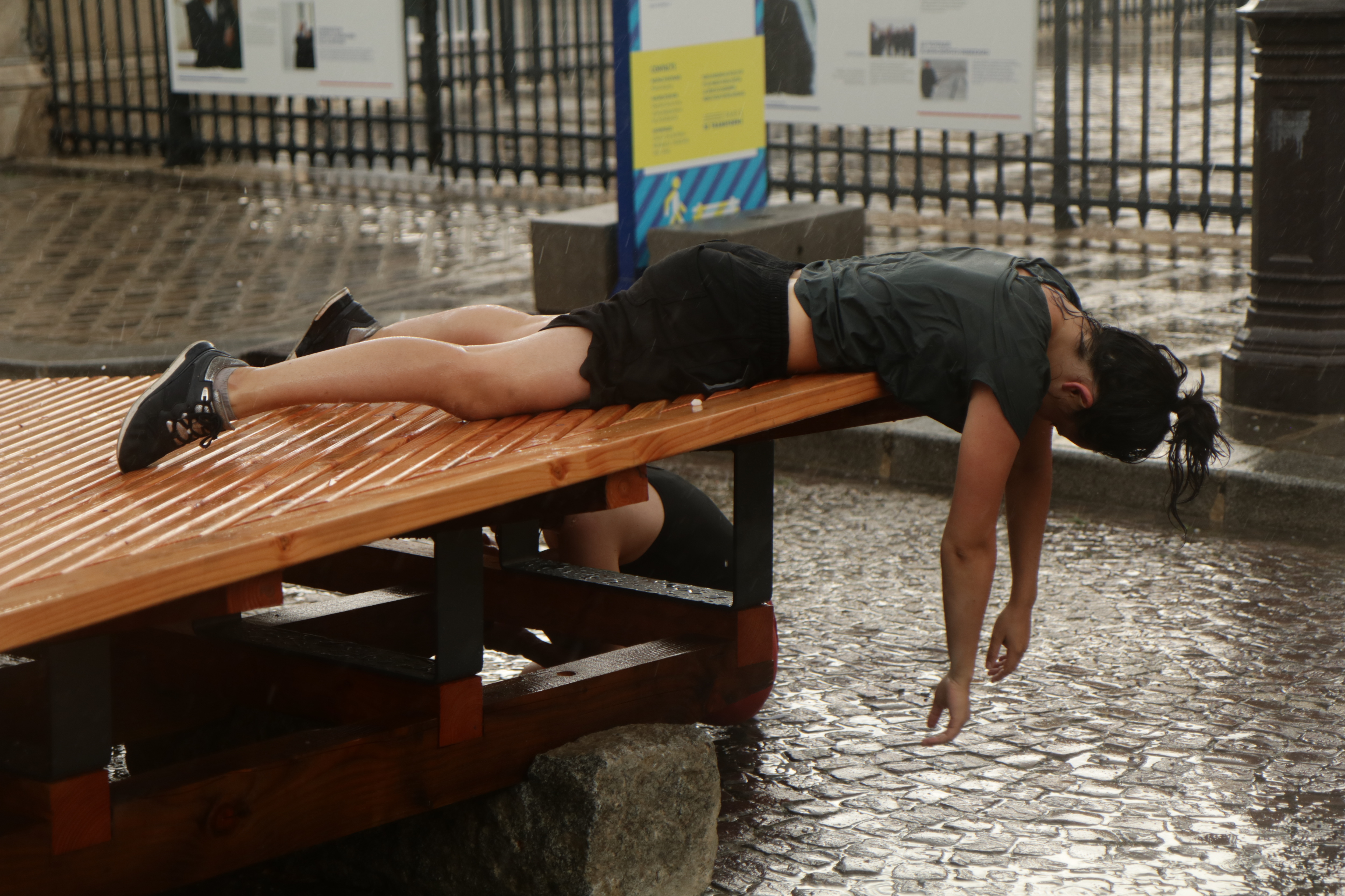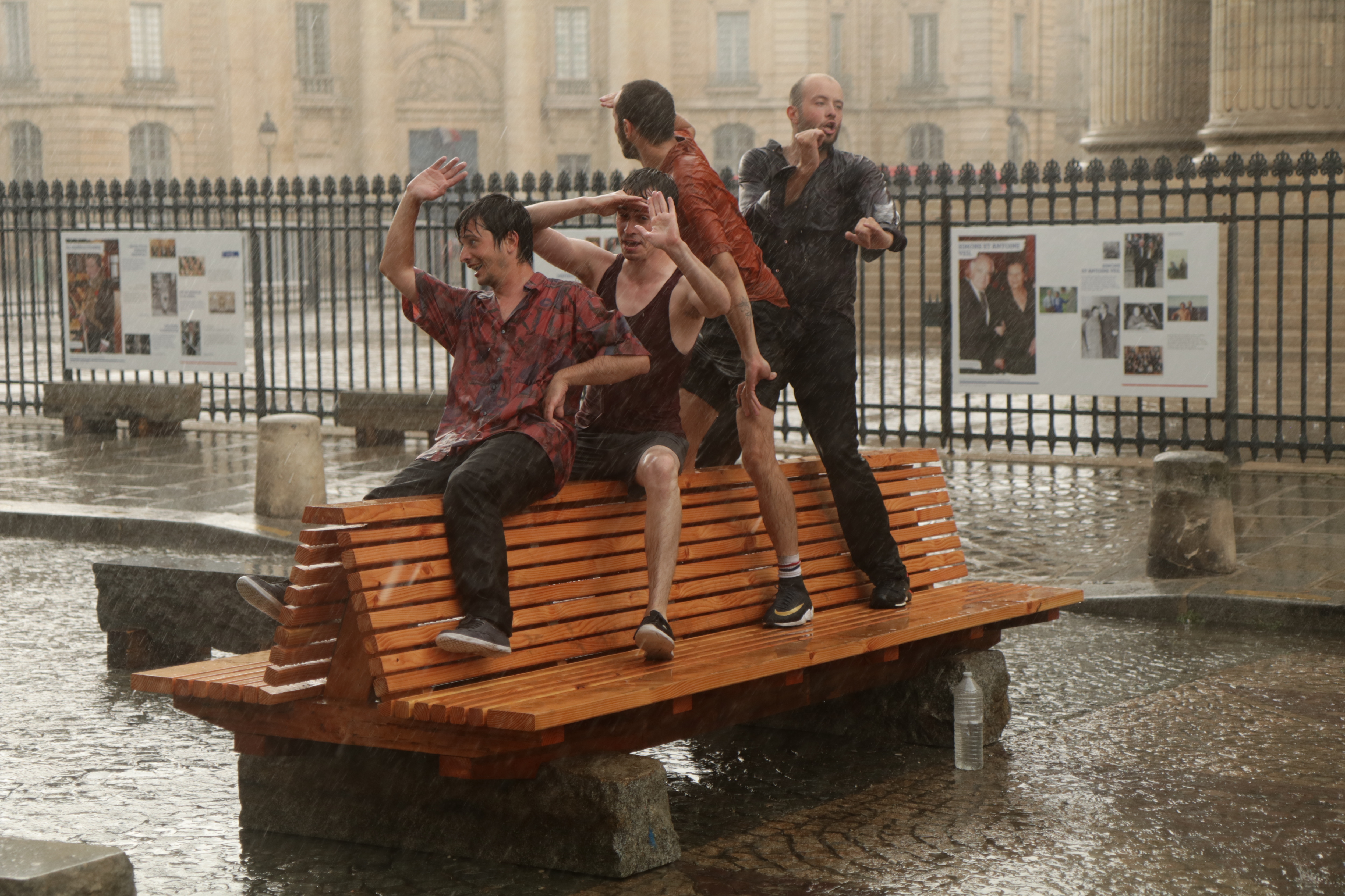 S’en suit un tour exploratoire de la place où chaque installation sert de décor pour fabriquer une nouvelle histoire, physique, chorégraphique ou sonore. Comme ce moment où ils sont tous cachés derrière des bancs et poussent des cris d’animaux connus et moins connus. À ce moment-là, la pluie prend des allures de mousson et l’on se retrouve dans la jungle.