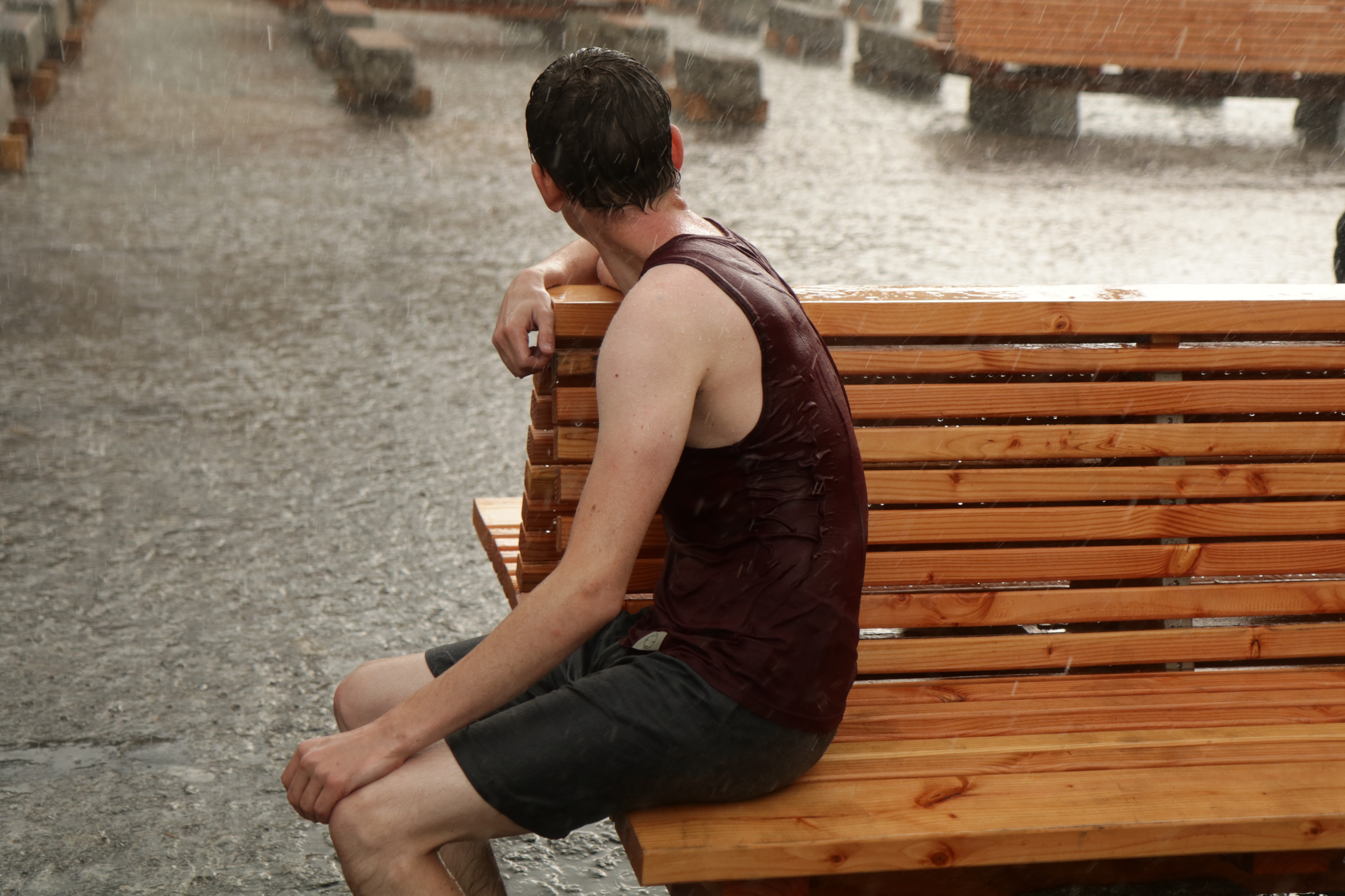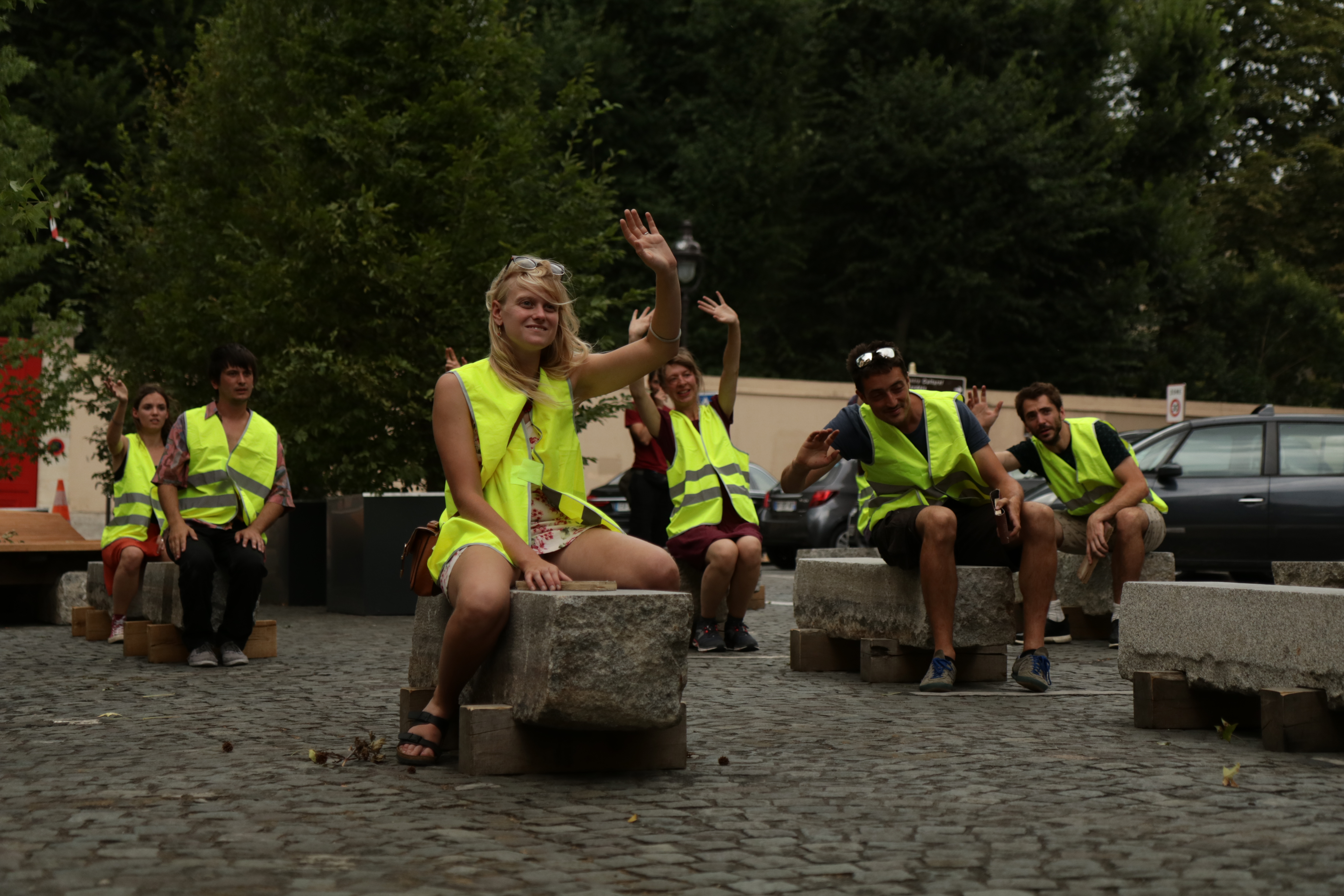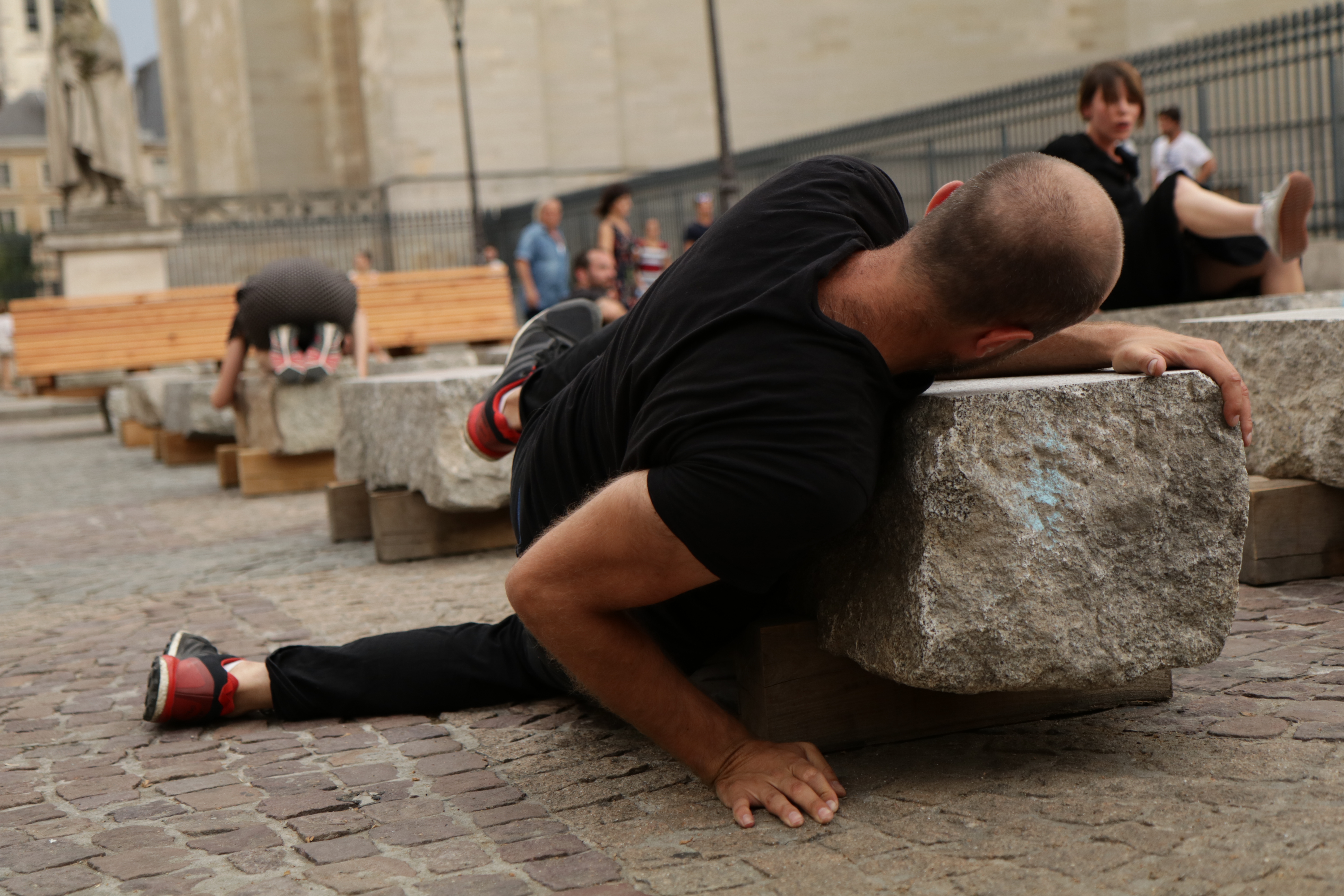 S’en suit un tour exploratoire de la place où chaque installation sert de décor pour fabriquer une nouvelle histoire, physique, chorégraphique ou sonore. Comme ce moment où ils sont tous cachés derrière des bancs et poussent des cris d’animaux connus et moins connus. À ce moment-là, la pluie prend des allures de mousson et l’on se retrouve dans la jungle.