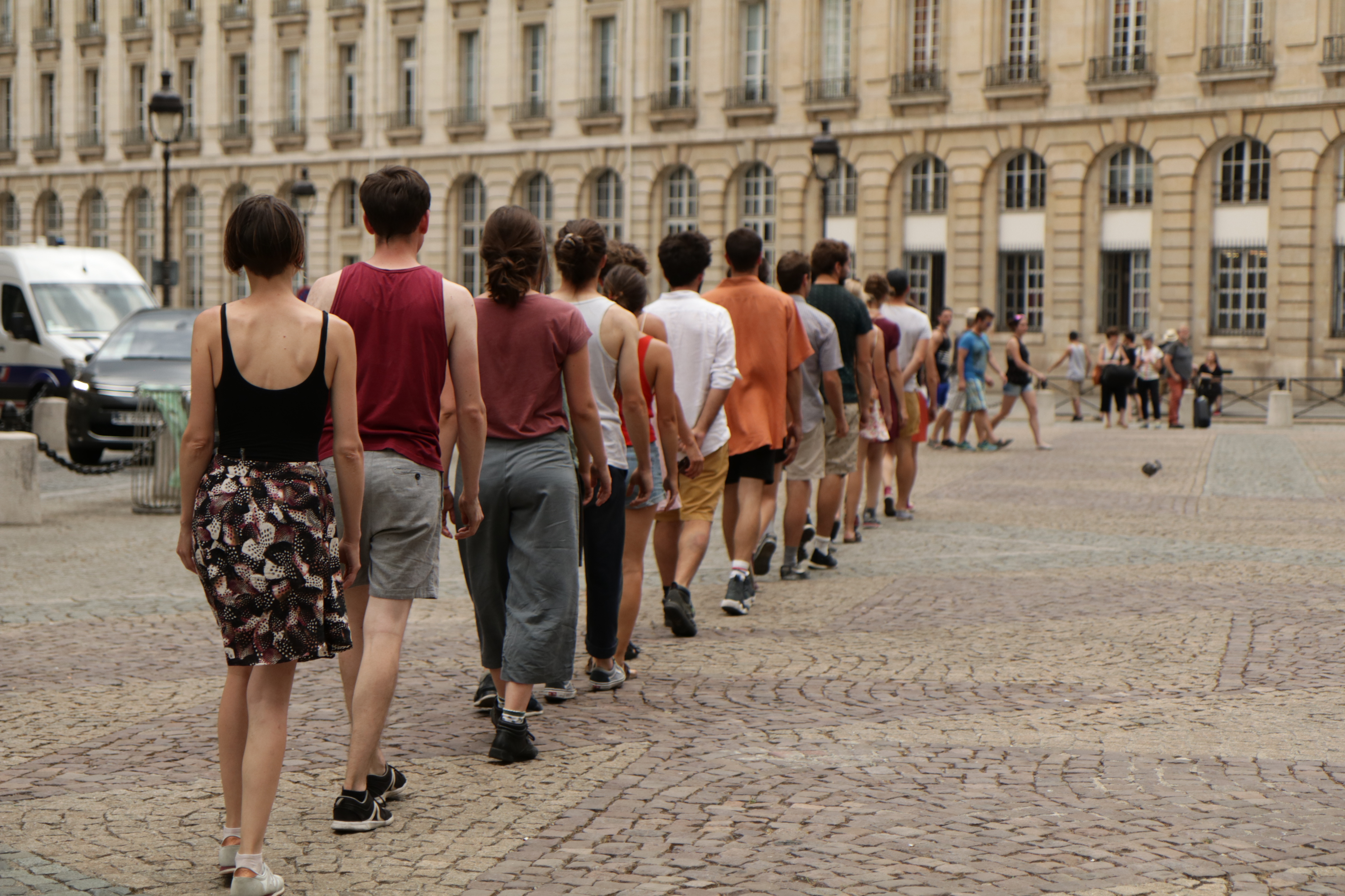 Le temps est lourd, le ciel chargé, mais les nuages tiennent bon durant les répétitions. À l’heure prévue, les Bimeurs, vêtus de noir, sont disséminés parmi les badauds et marchent en direction de l’un des leurs, immobile face au monument.