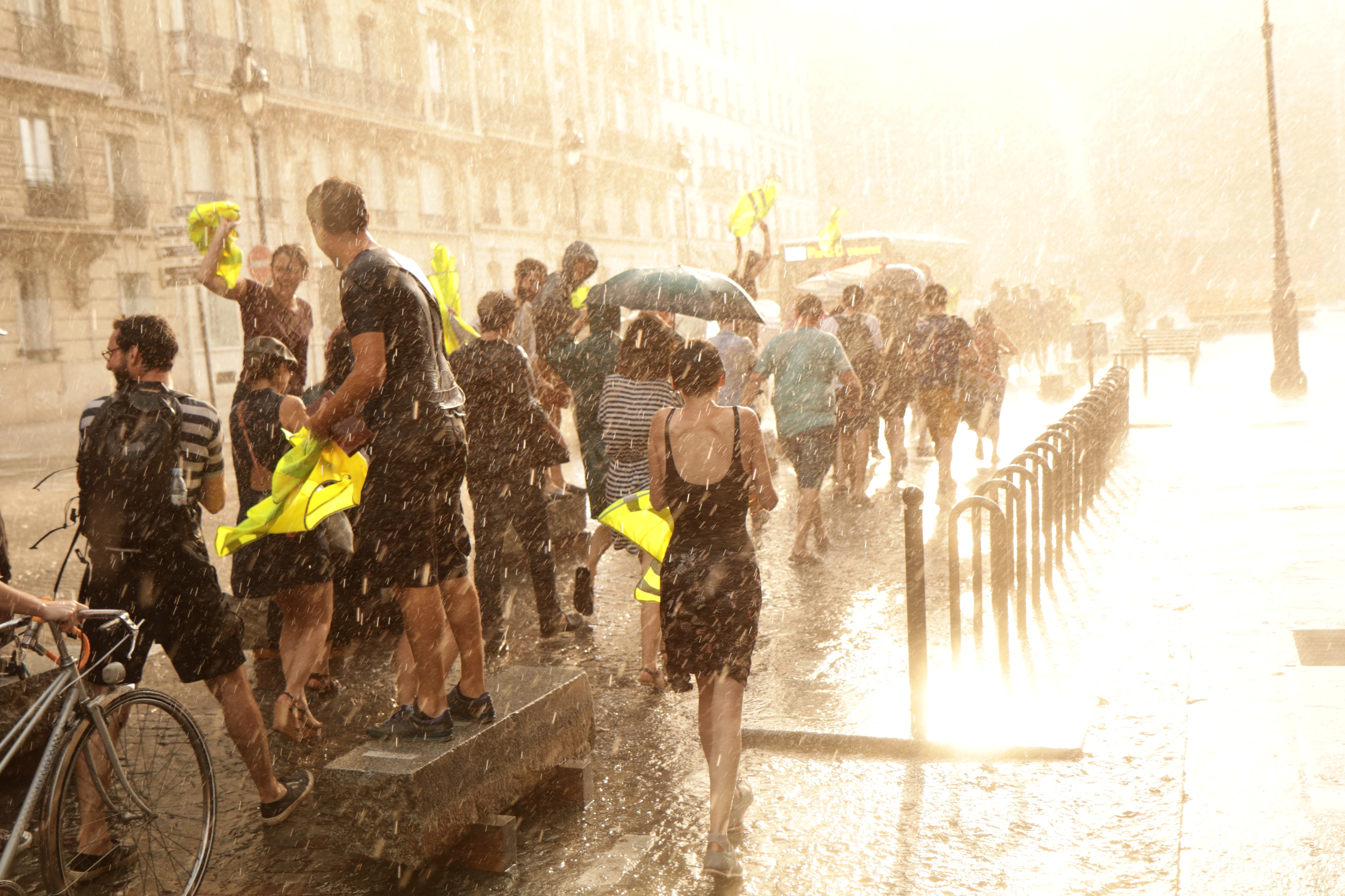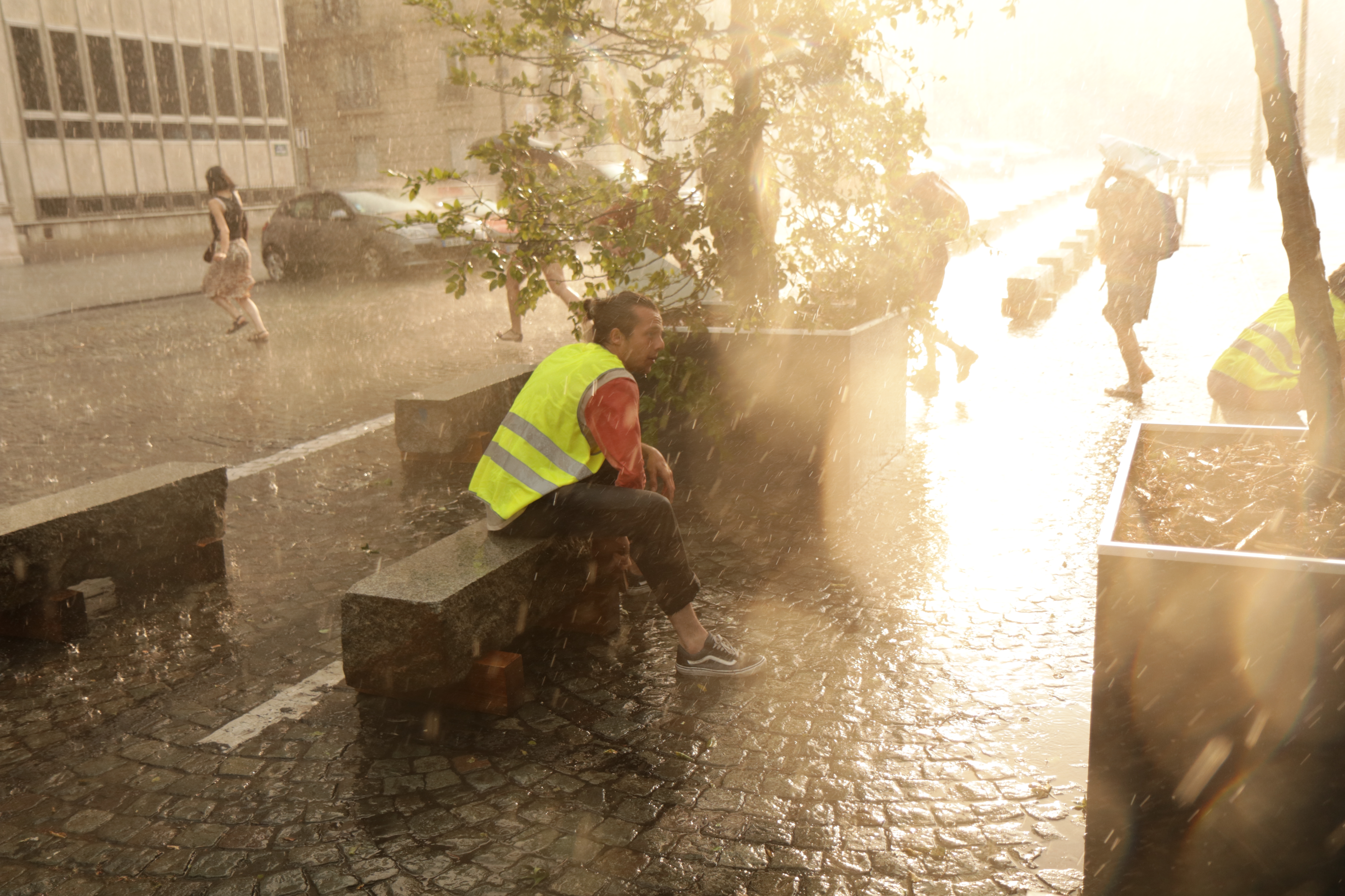 Lorsqu’ils se mettent à appeler les morts du Panthéon en hurlant leurs prénoms peut-être franchissent-ils une frontière interdite ? Alors qu’ils forment un radeau de la méduse imaginaire, un véritable déluge nous tombe dessus, fait de grêlons gros comme des cerises. Rués de coups par le ciel, nous sommes contraint d’arrêter l’expérience et courons nous abriter devant l’entrée de la mairie.