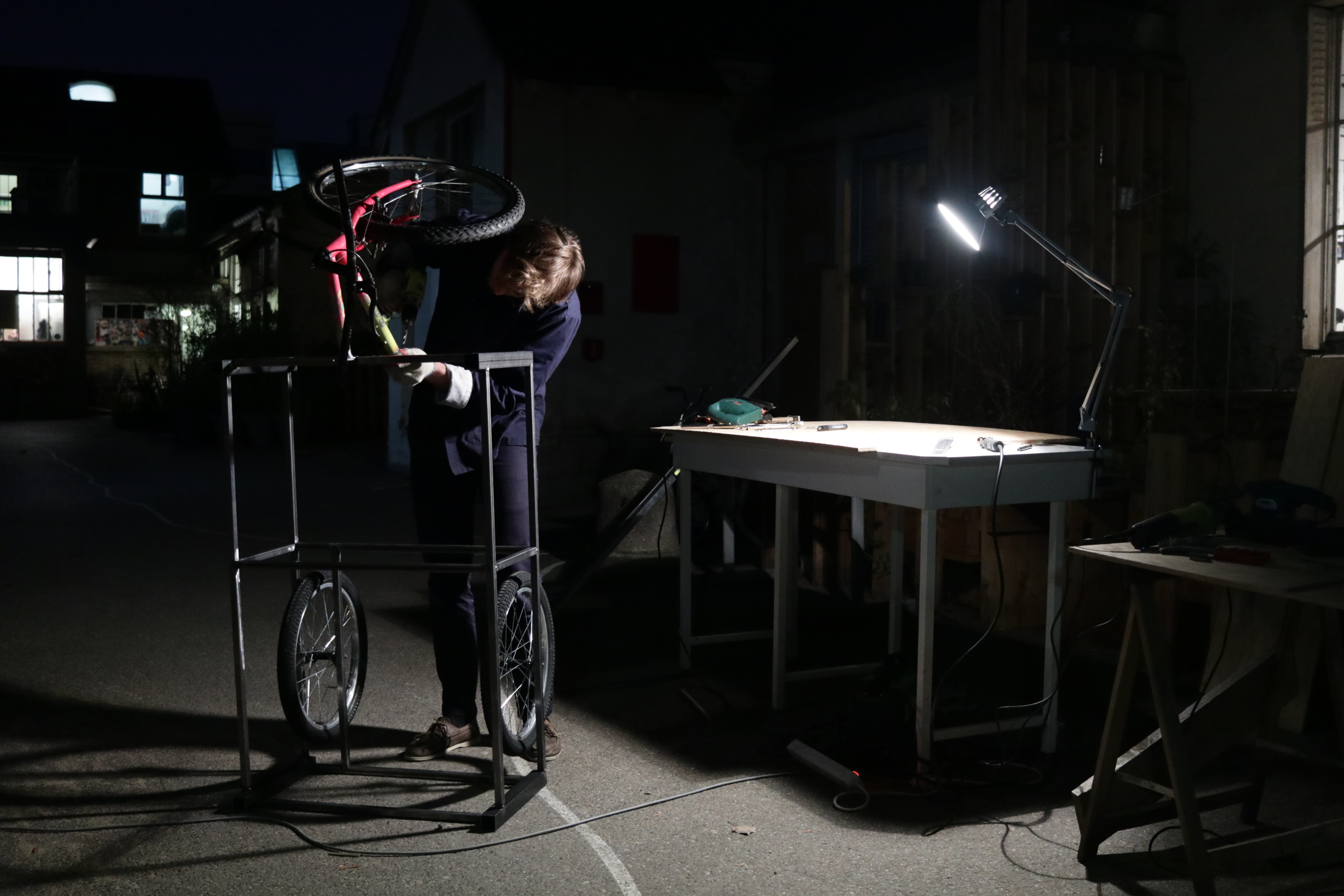 L’enjeu premier de l’atelier est d’explorer un environnement connu pour le redécouvrir, alors on imagine un outil mobile nous permettant de nous déployer n’importe où. Les architectes réalisent une boite à outils montée sur un cadre de vélo dont le dessus affiche une carte du quartier et qui contient les outils dont nous avions besoin pour nos divers jeux et exercices. C’est l’hiver, donc tout naturellement, on nomme l’atelier mobile « À tes souhaits ». Dans un second temps, on identifie plusieurs points du 14e assez abrités du trafic routier pour pouvoir y mener sereinement nos jeux.