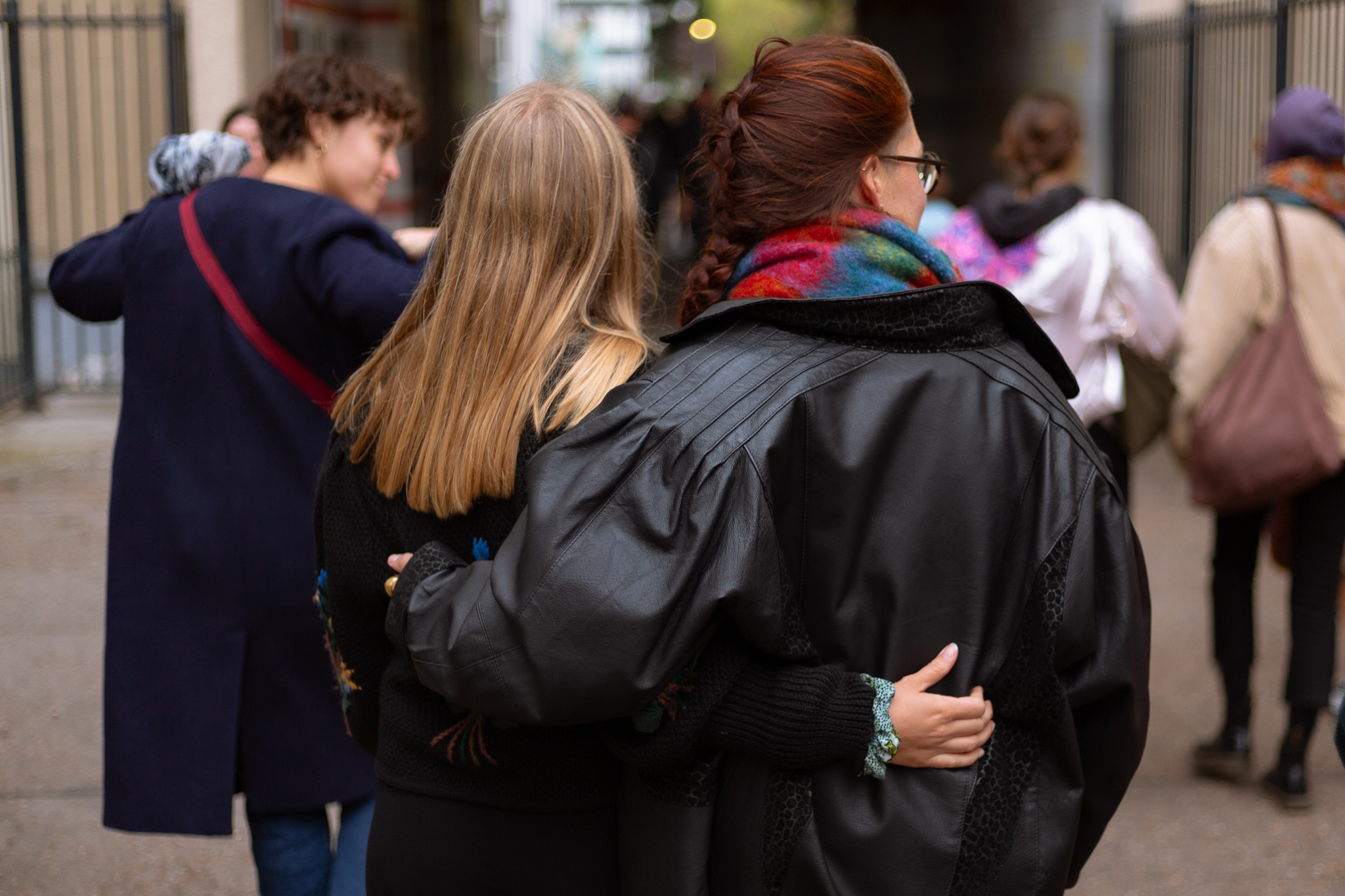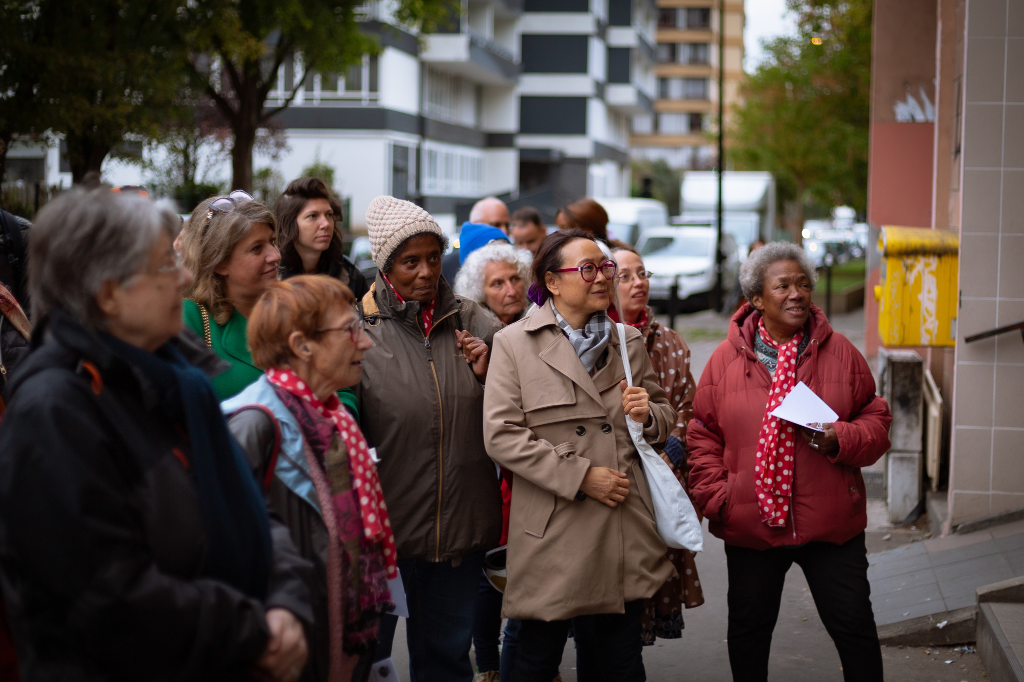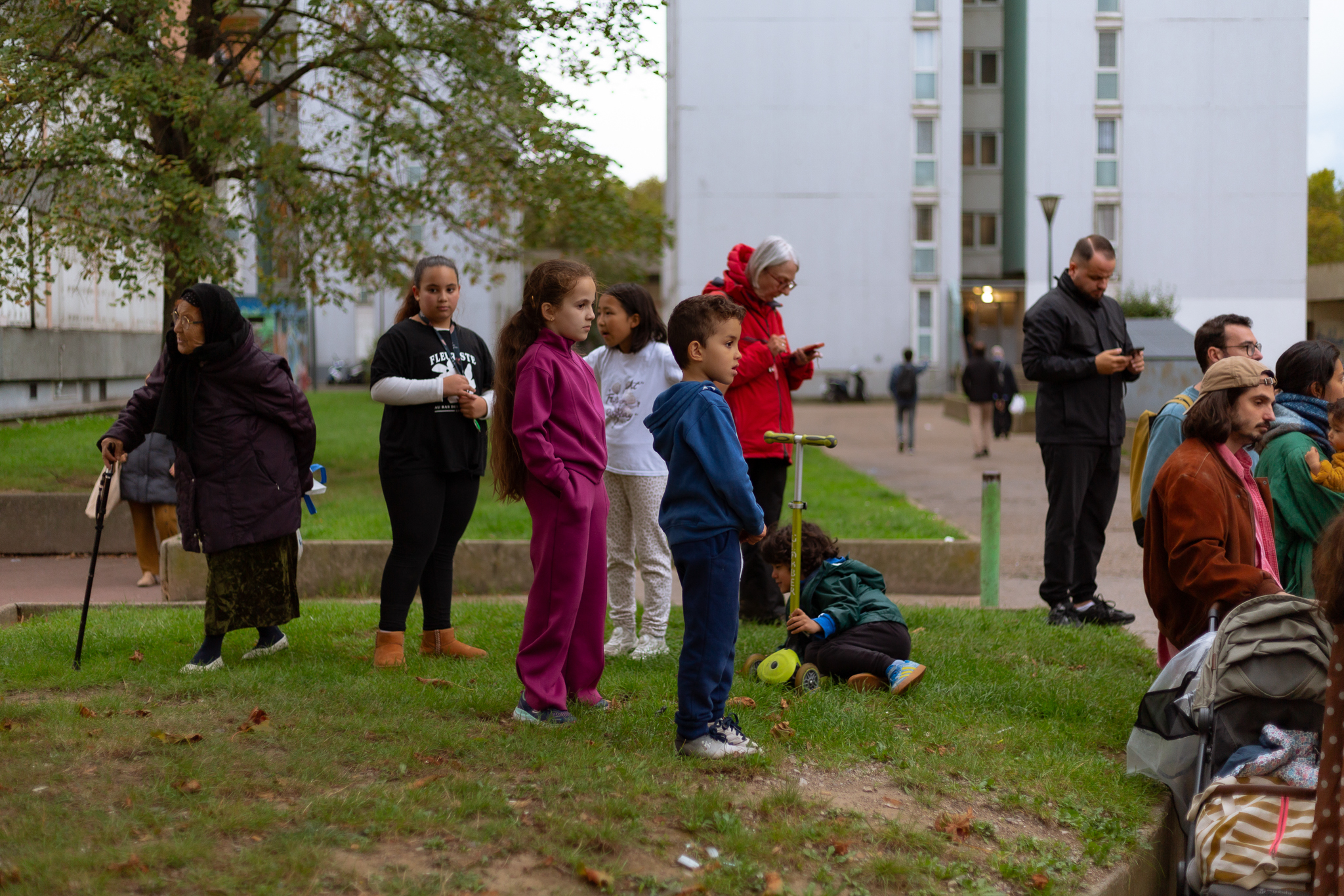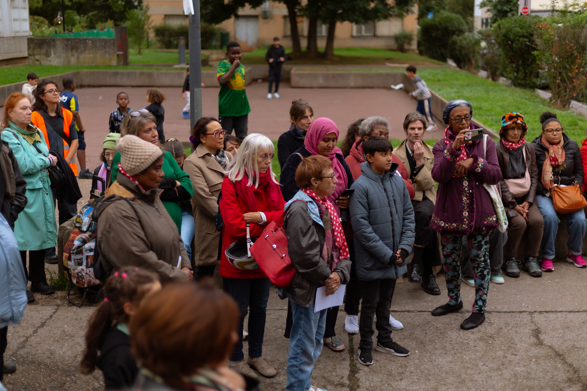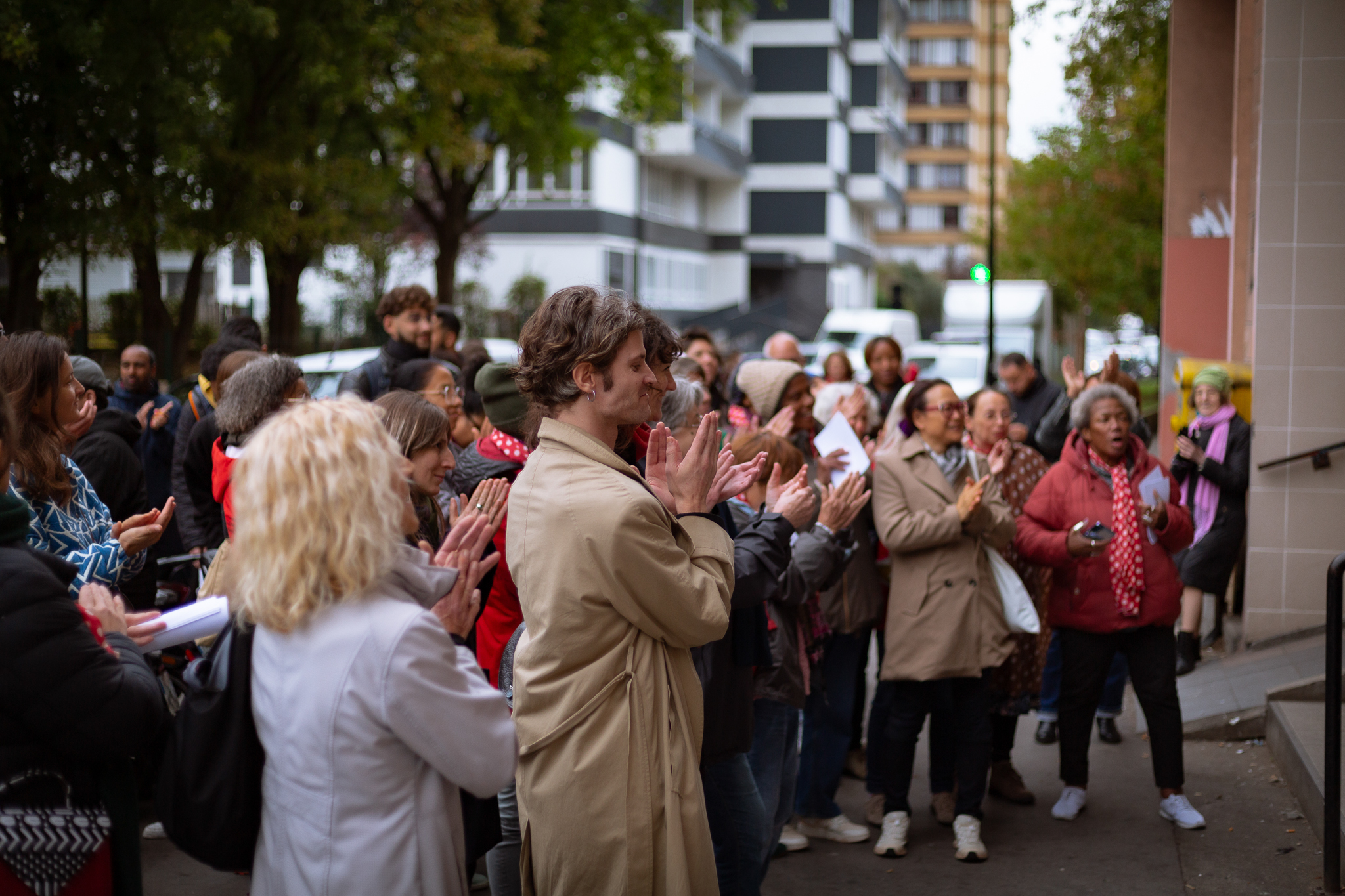Prêt du parc et du terrain de foot, des jeunes arrêtent momentanément leurs jeux pour venir écouter les chants. La gravité des paroles tranche avec la brillance des voix, nous sommes collectivement plongés dans un état de contemplation solennelle. Partout où la chorale s’installe, l’écoute s’impose, par la profonde vérité des mots, par la justesse de la posture du chœur, par l’authenticité de son émotion quand ses membres se tiennent ensemble par la taille comme pour former un tout vibrant.