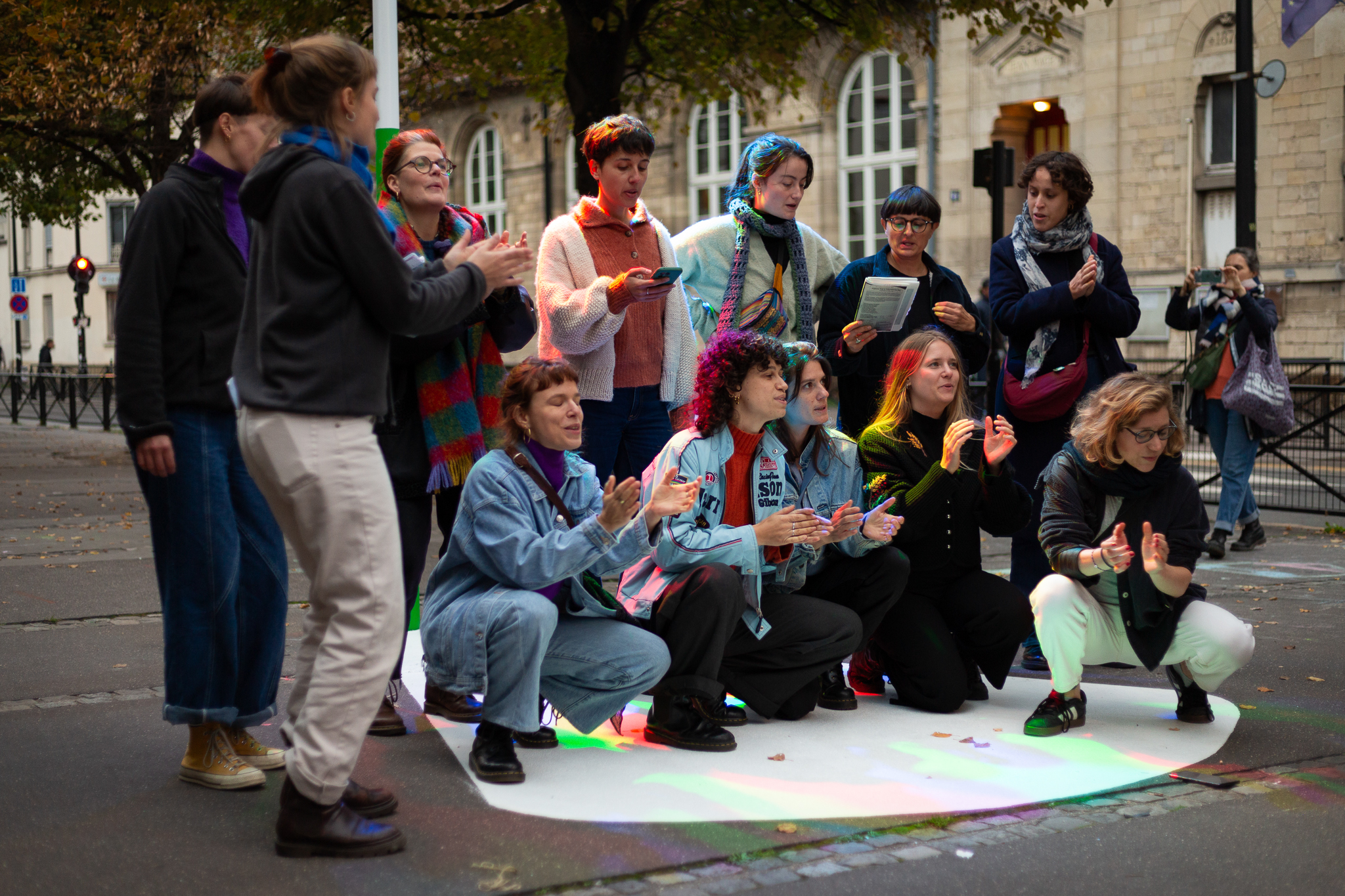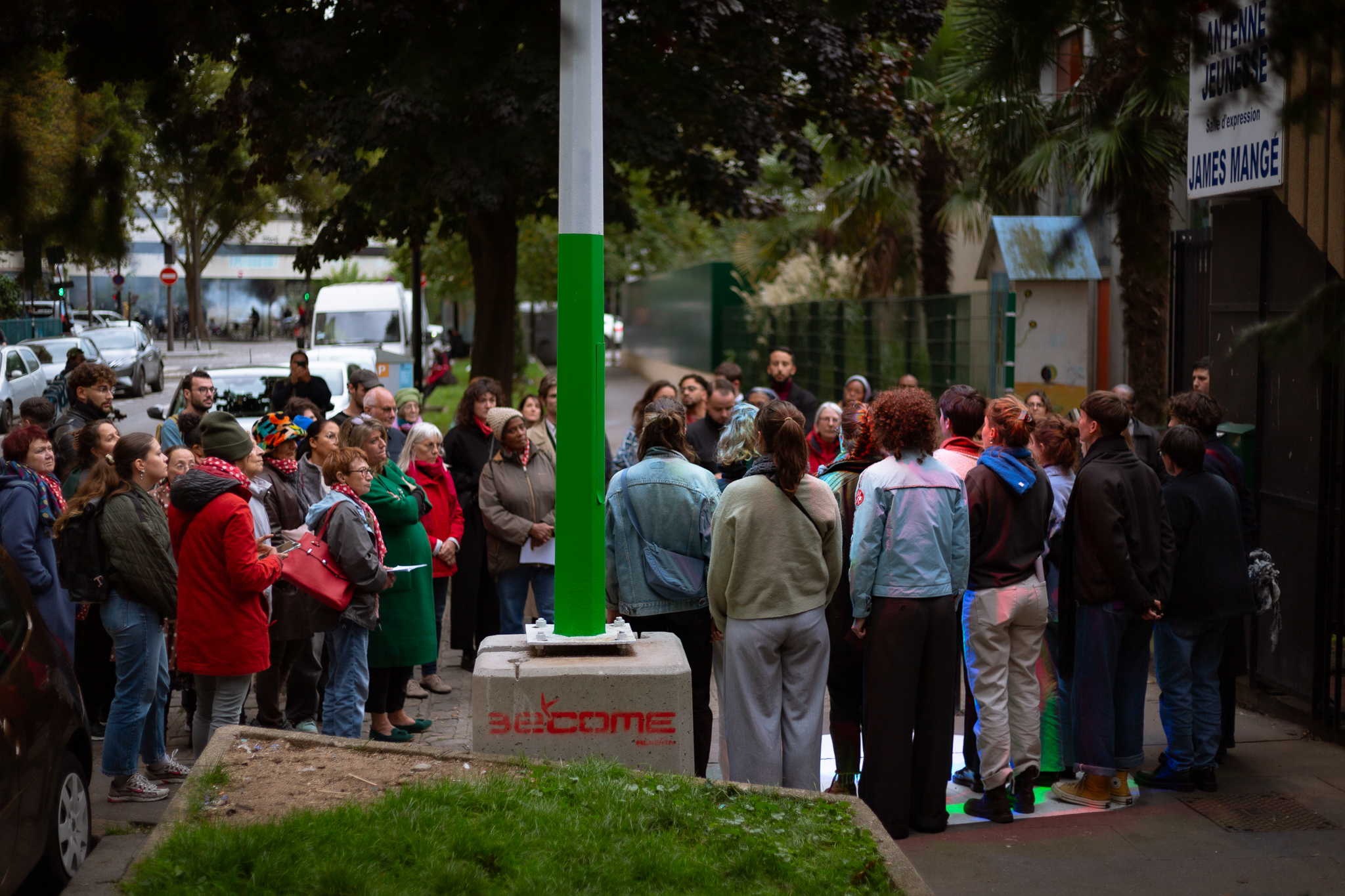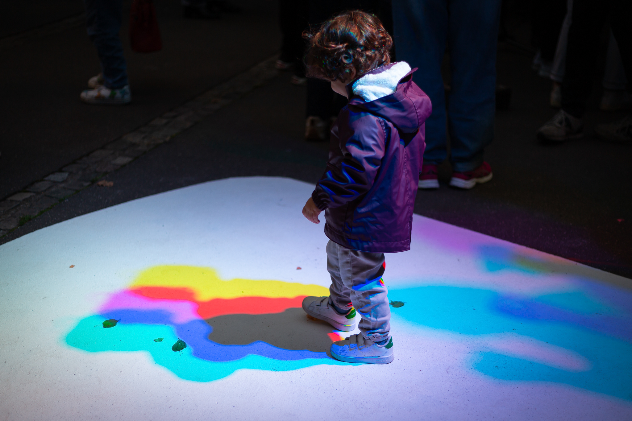 Les lumières installées dessinent des ombres tricolores lorsque leur faisceau rencontre les corps, elles apportent une dimension festive dans la rue. À la tombée de la nuit, on surprendra un jeune danser seul dans leur halo, observant le mouvement de ses ombres lumineuses s’animer sur le sol.