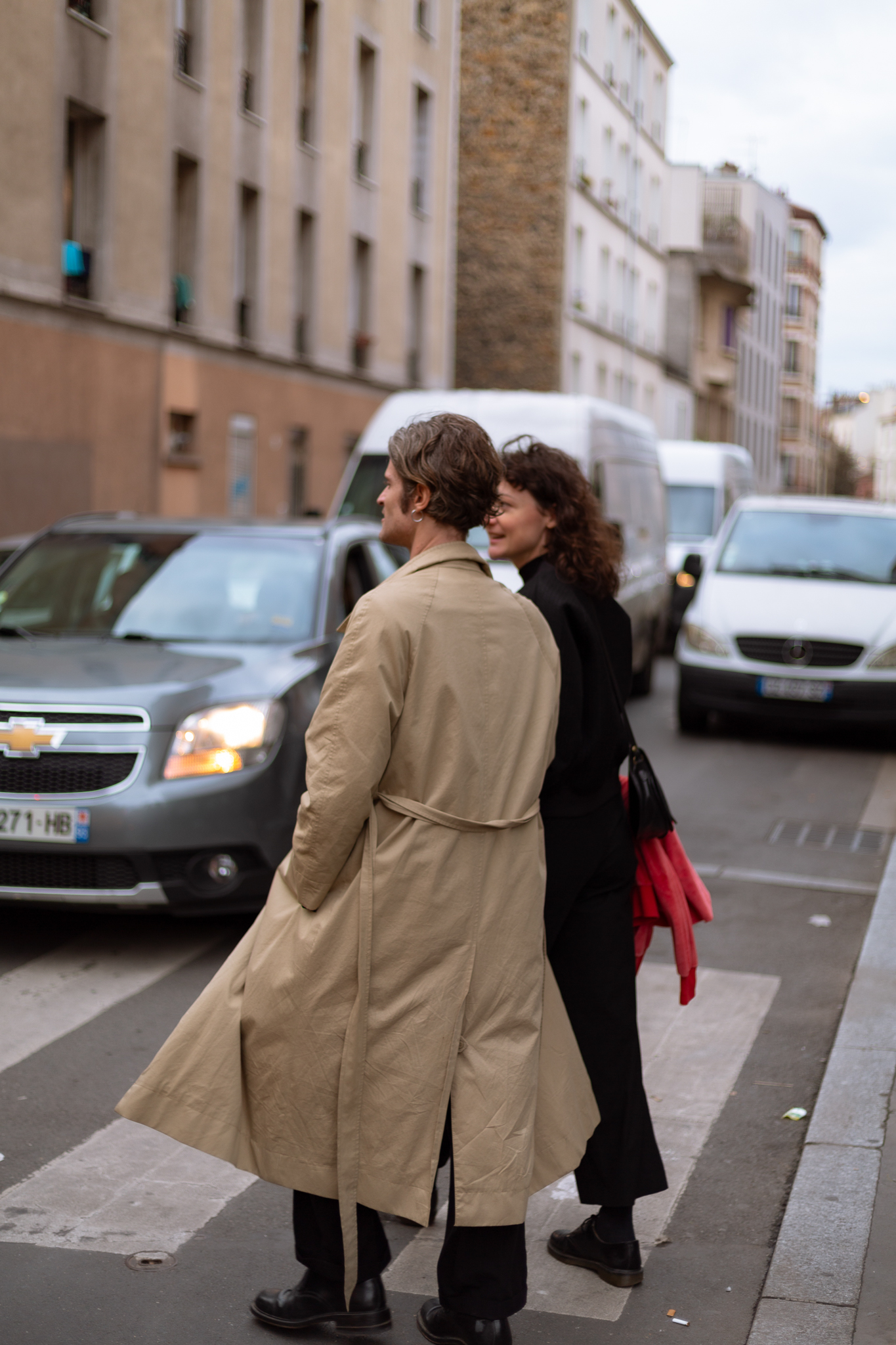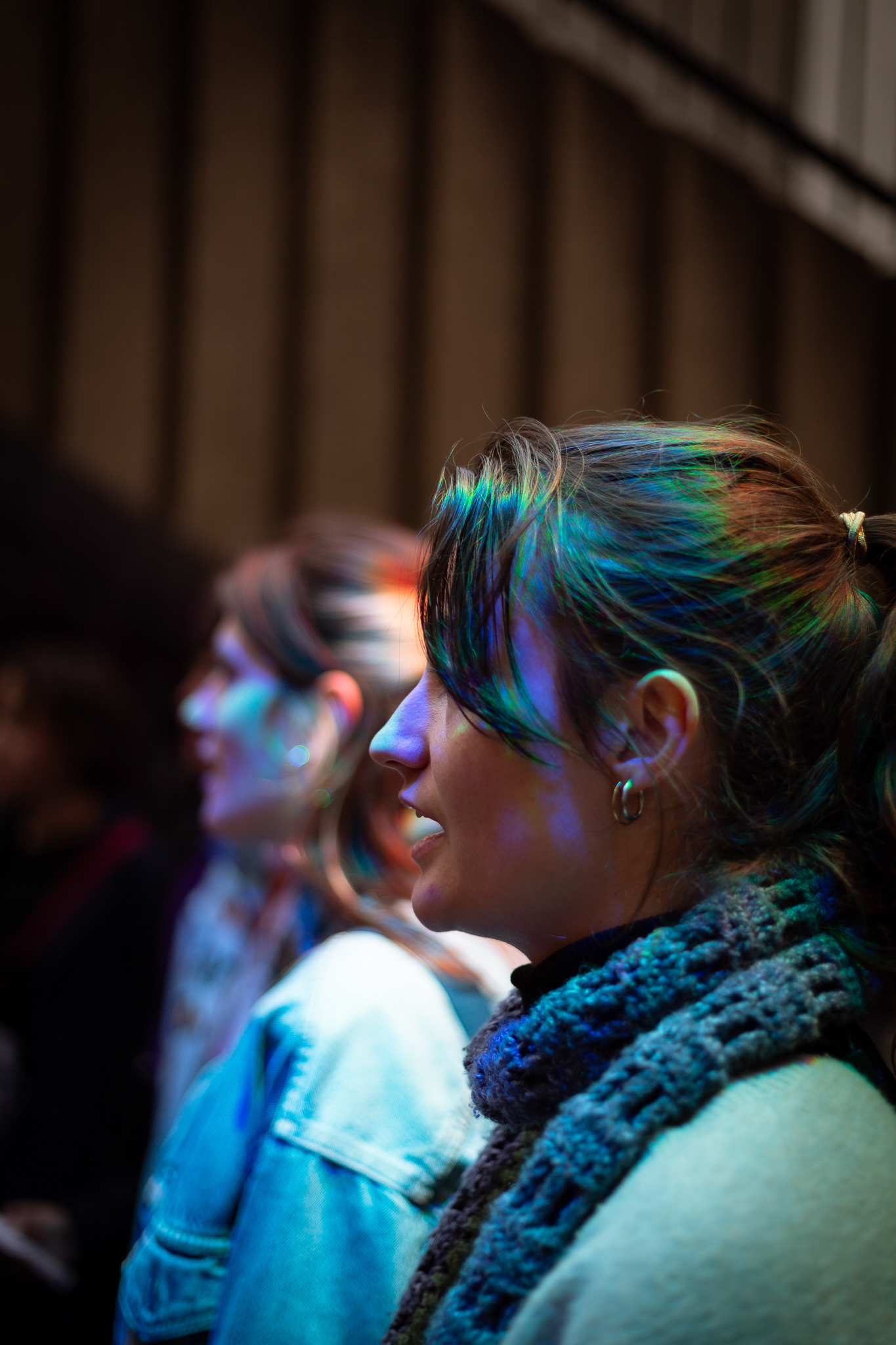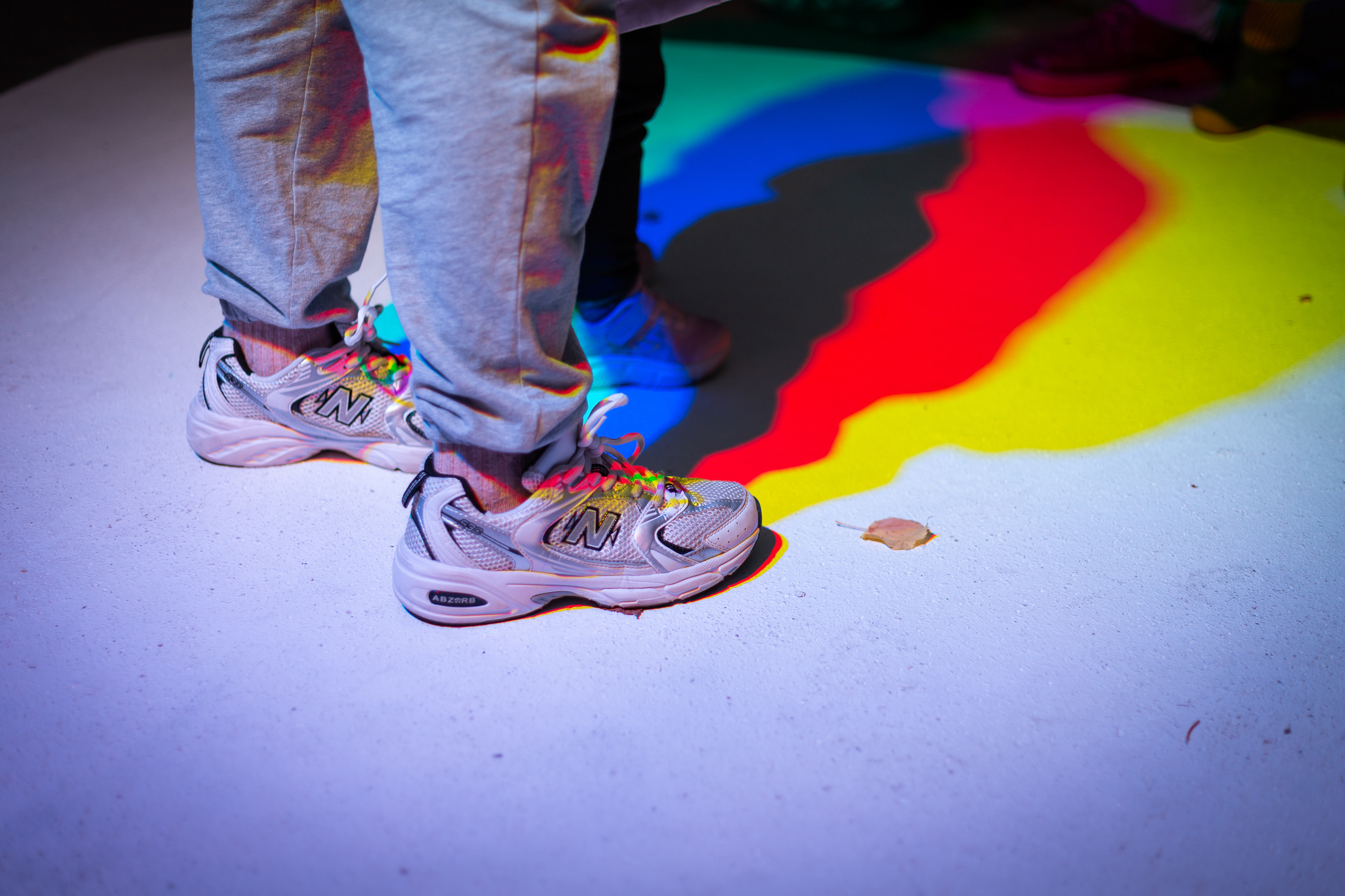 Les lumières installées dessinent des ombres tricolores lorsque leur faisceau rencontre les corps, elles apportent une dimension festive dans la rue. À la tombée de la nuit, on surprendra un jeune danser seul dans leur halo, observant le mouvement de ses ombres lumineuses s’animer sur le sol.