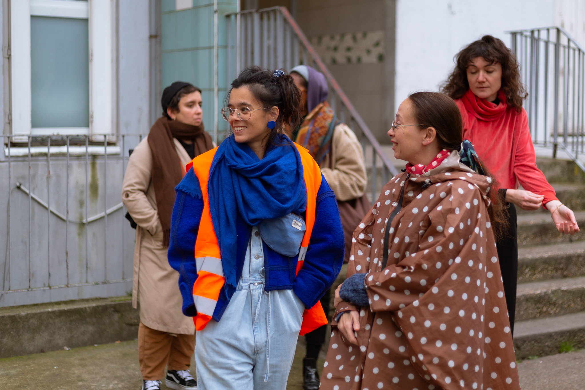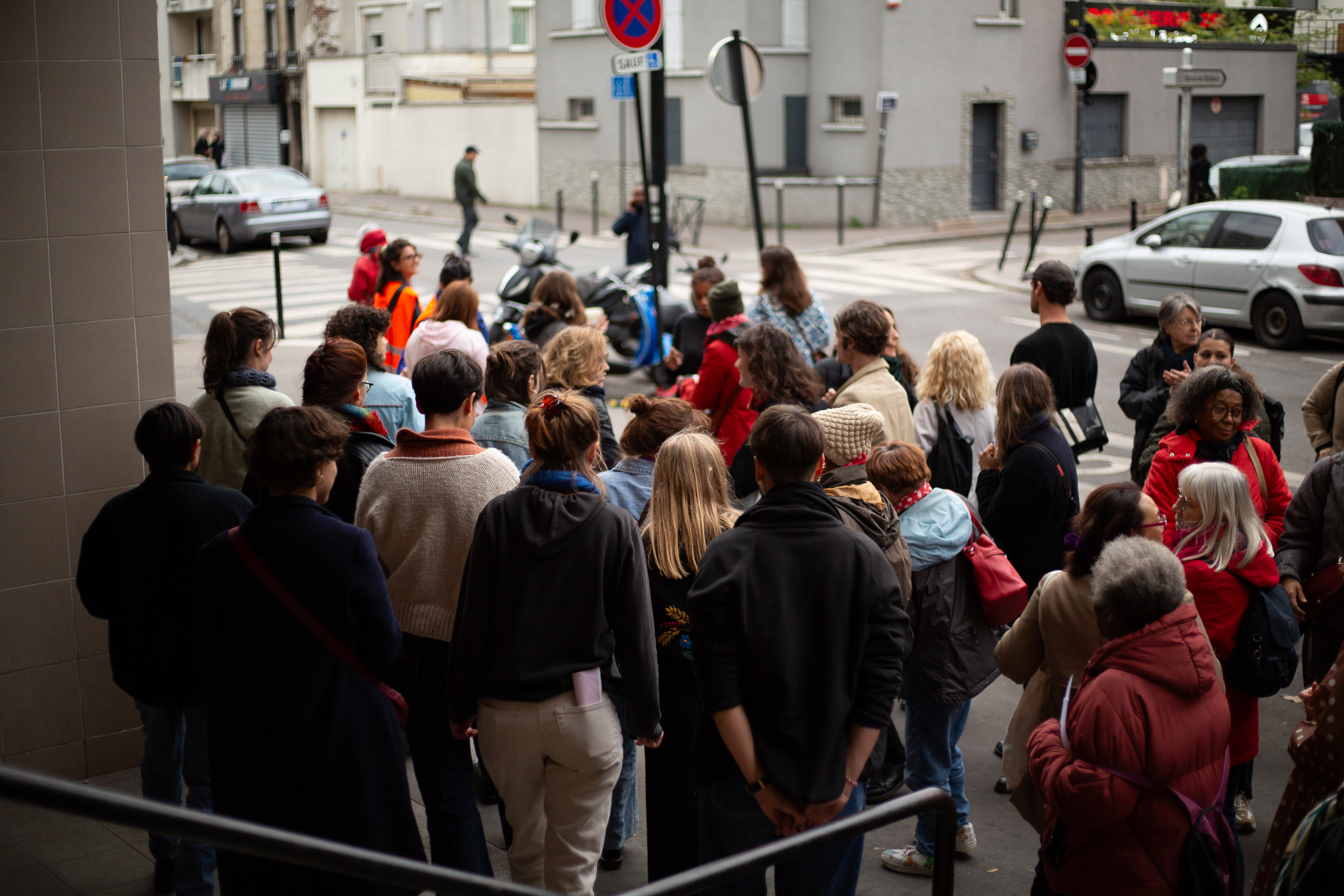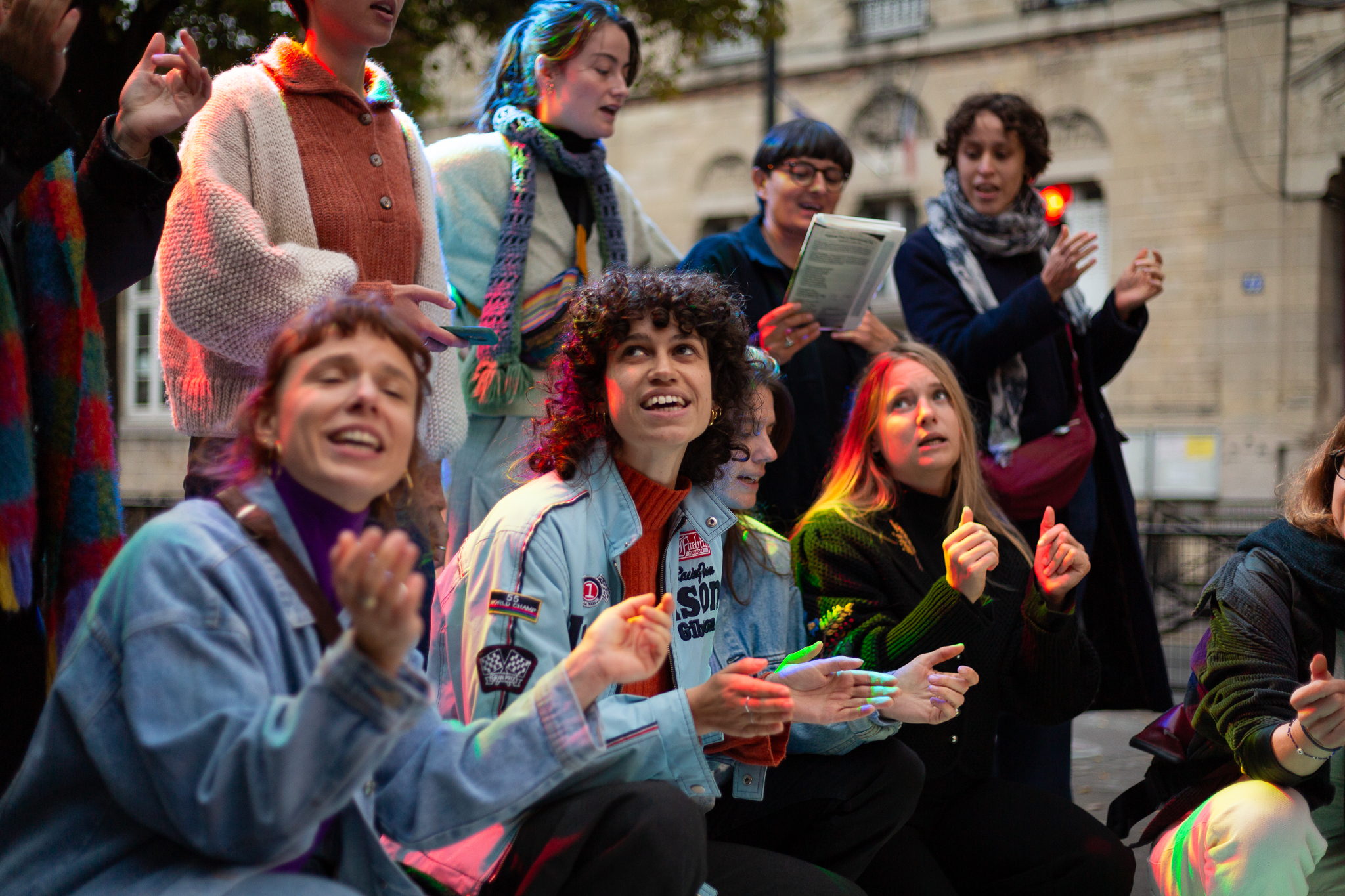 Au long de notre trajet, le chœur de femmes Nos lèvres révoltées, chante des chants féministes du monde entier, tantôt en marchant, tantôt en marquant un arrêt. Nous formons alors, avec le groupe de participants, une sorte de vaisseau humain de bienveillance et de combativité, qui traverse un morceau de ville, enveloppé dans les voix du chœur.
