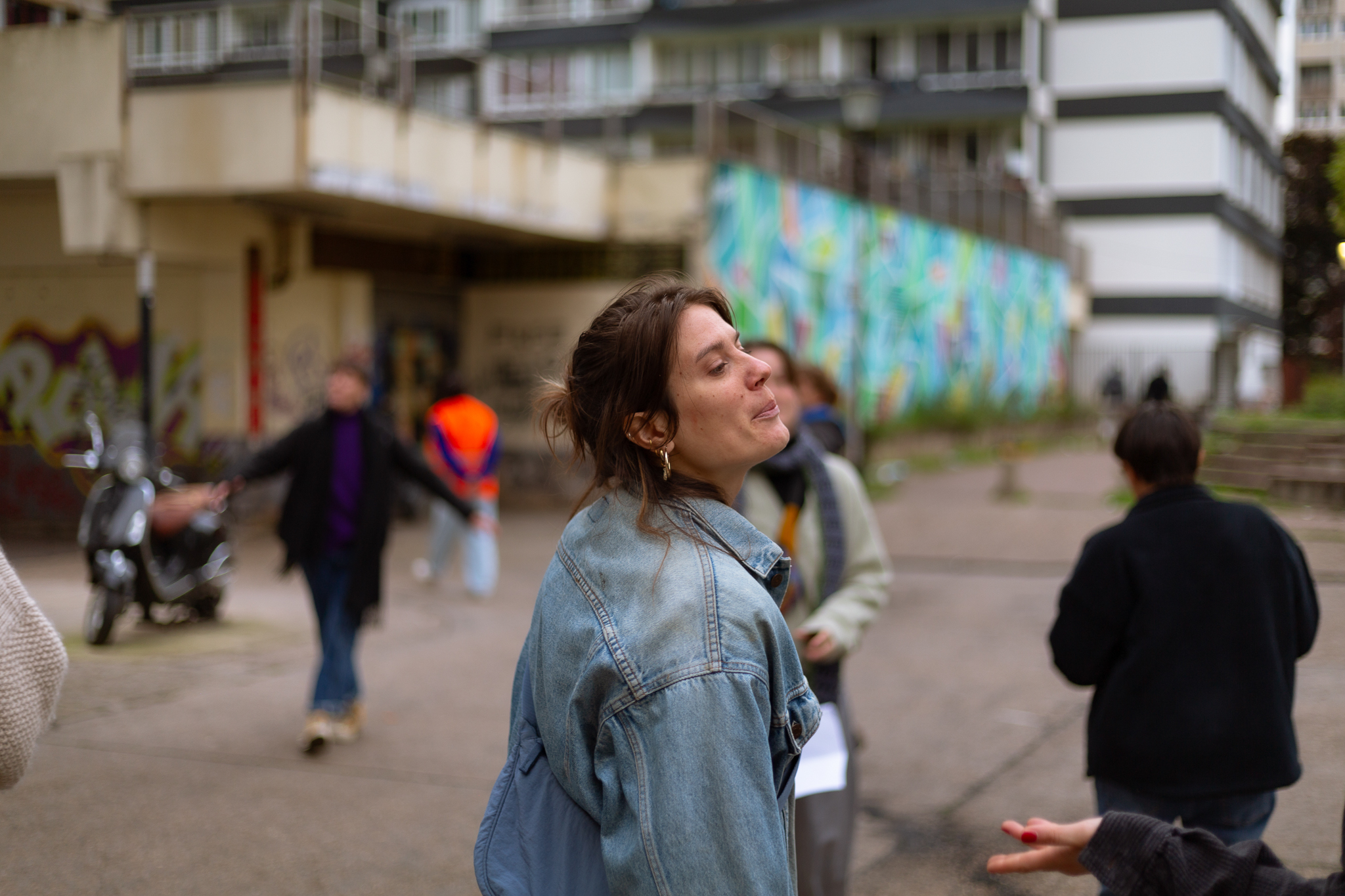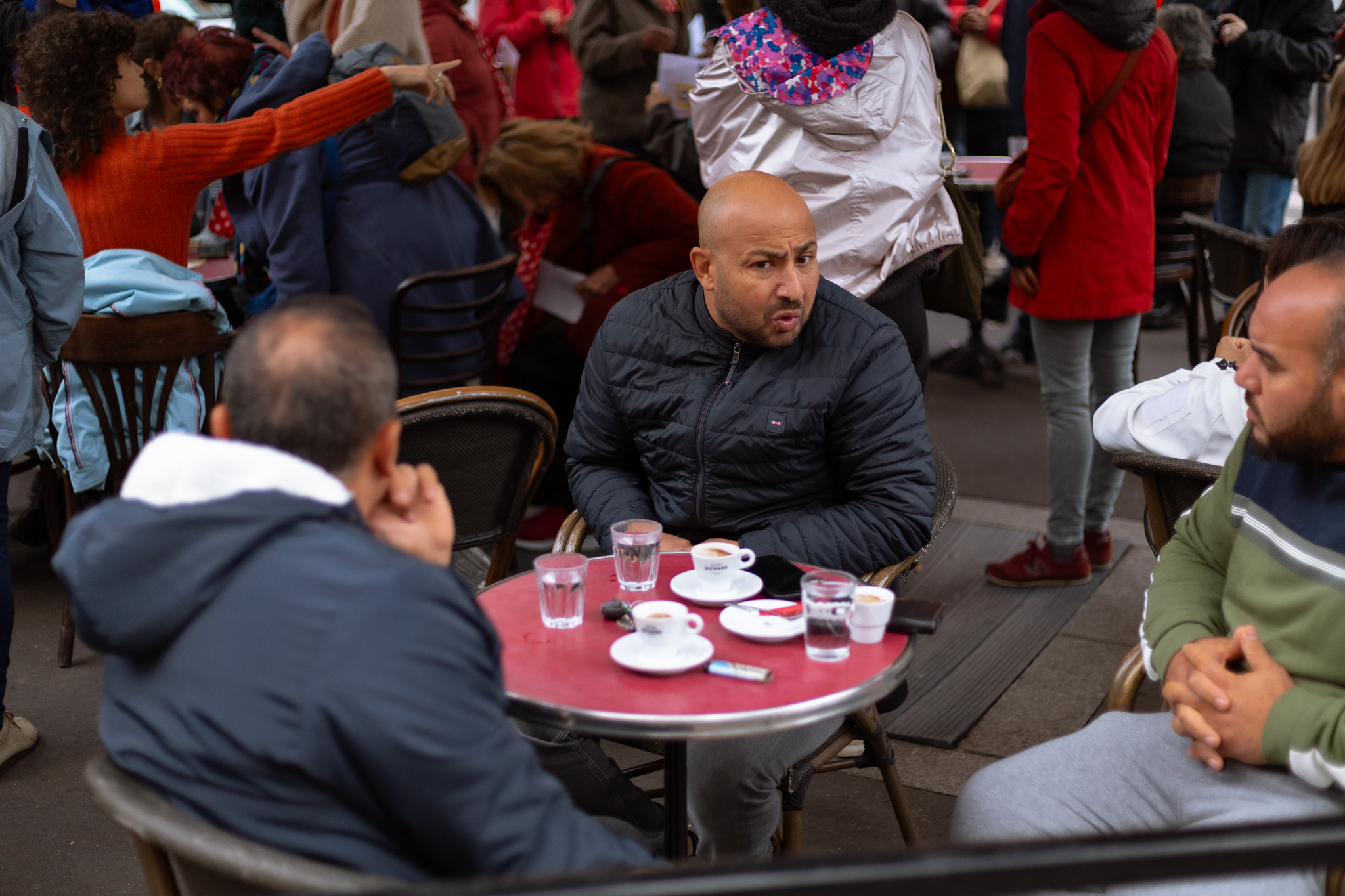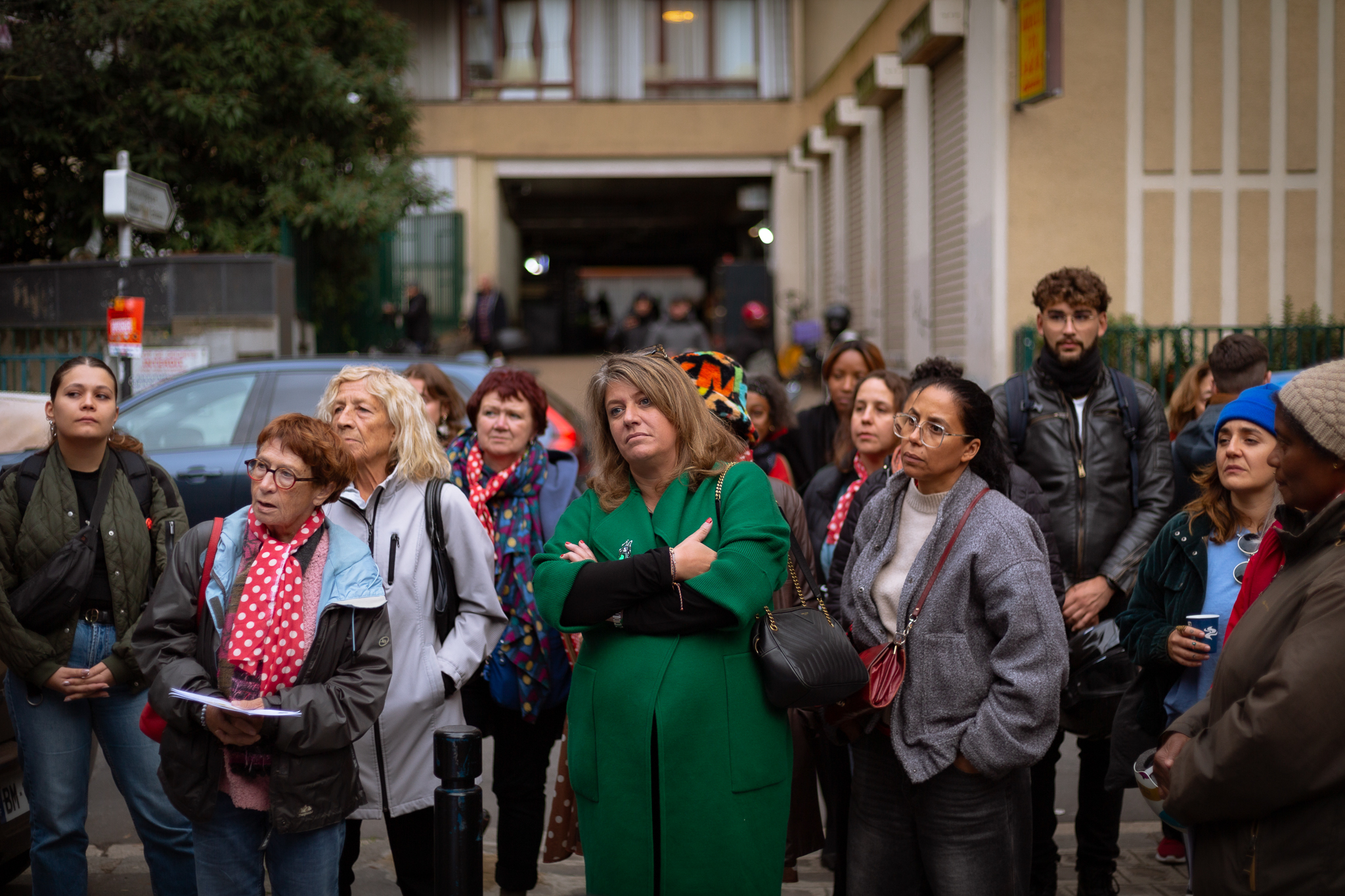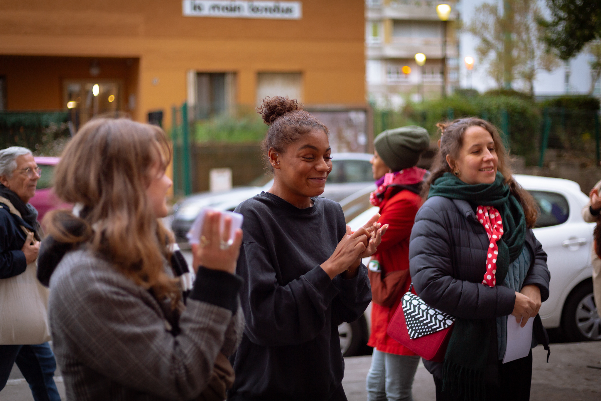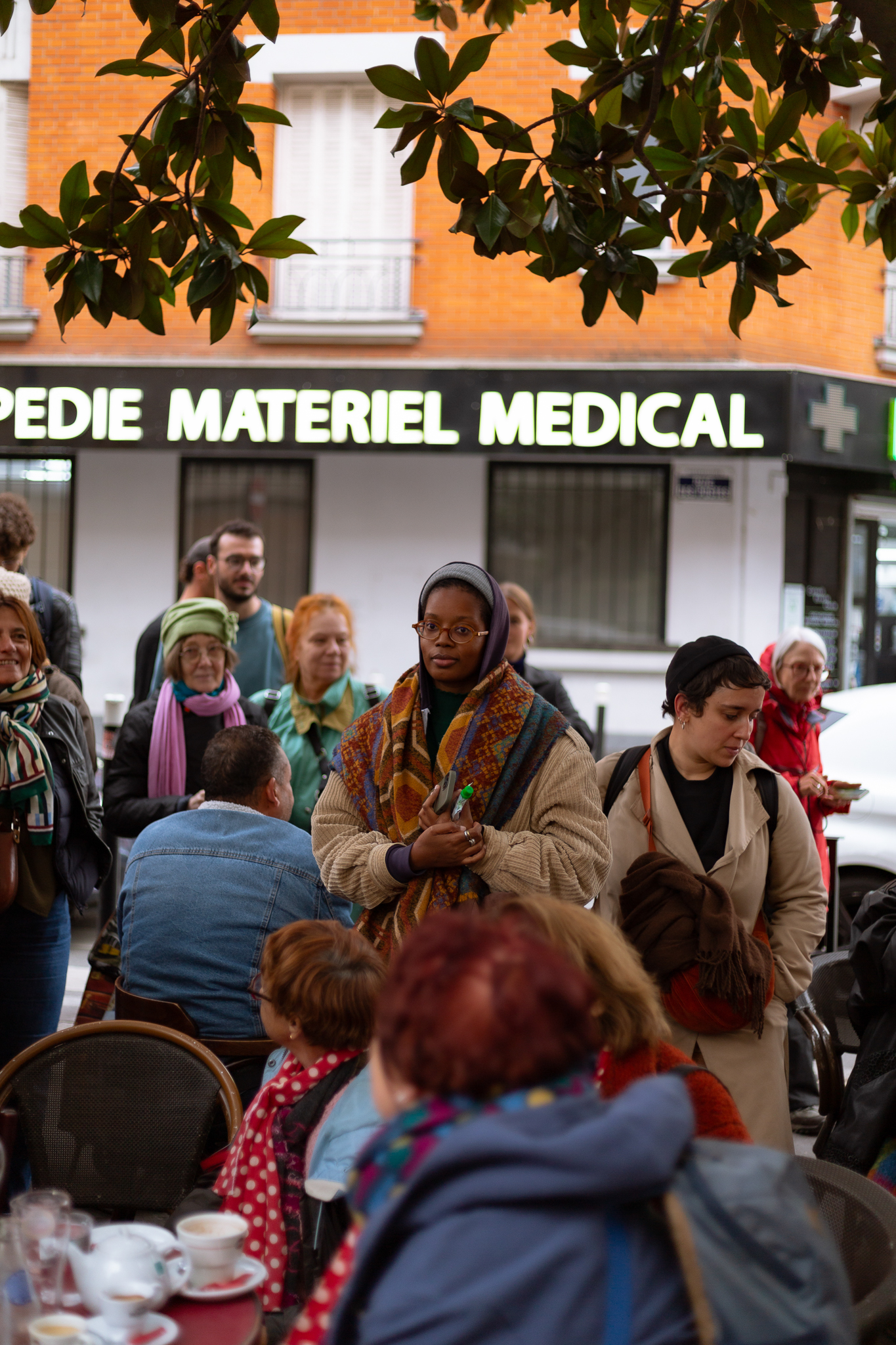 À la terrasse d’un café, le Collectif Place aux femmes s’installe et occupe le terrain, un espace se présentant souvent de fait, dans ces quartiers, comme réservé aux hommes, qui y fument, boivent et discutent entre eux. Les voix résonnent, les chants se diffusent et l’on raconte aussi l’histoire de l’association, protocole qui se répètera au fil de la marche, de lieu de soin en lieu de soin.
