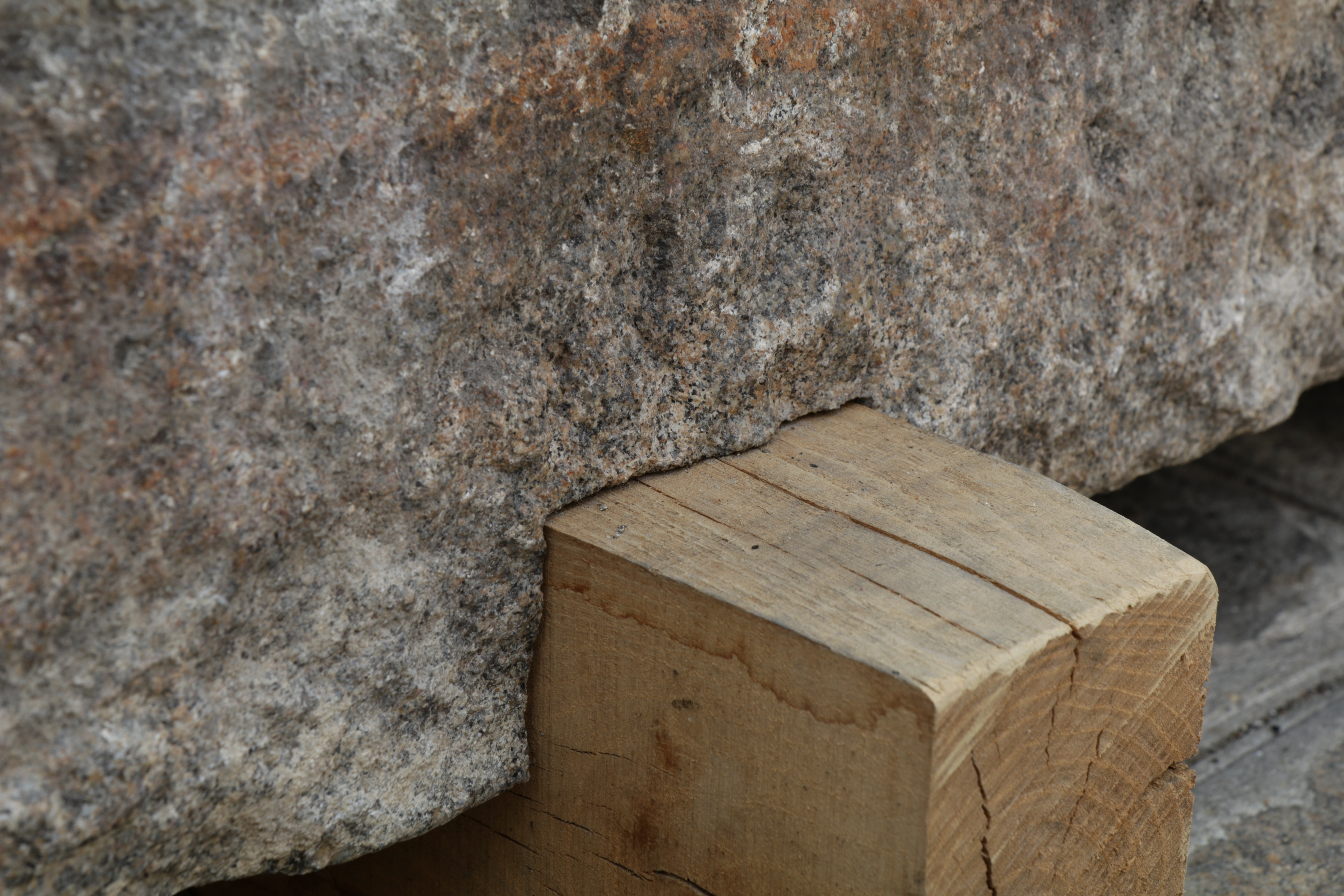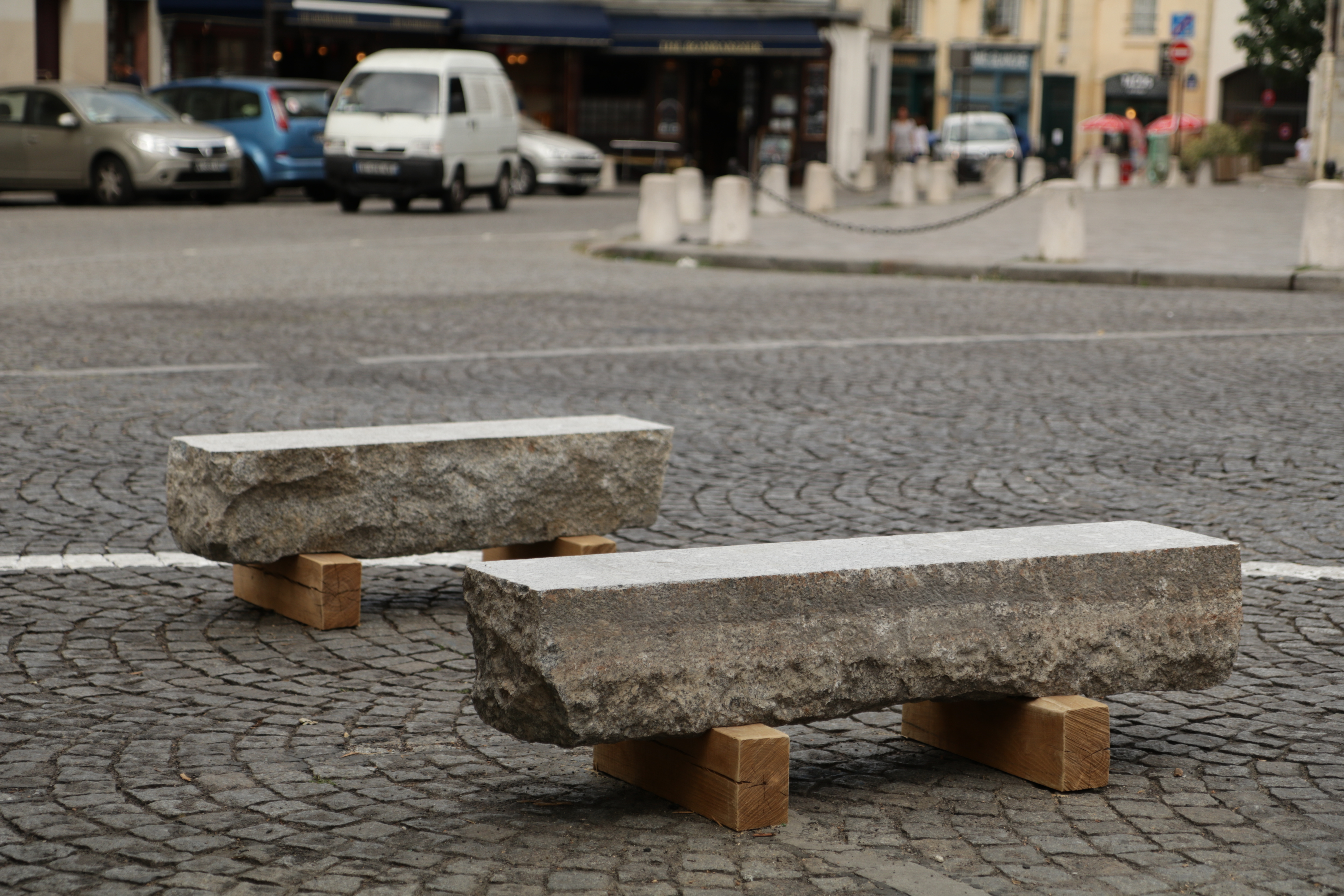Au CMA on sélectionne des bordures de trottoir dans les stocks selon des critères proposés par Les Monumentales et l’on vient réaliser des encoches dans ces dernières. Lesdites encoches serviront à insérer des pieds en bois qui permettent à la bordure brute de devenir un petit banc de pierre. Dans l’autre sens, elles servent à supporter des traverses sur lesquelles on peut faire émerger une plateforme, des tables, un banc en bois.