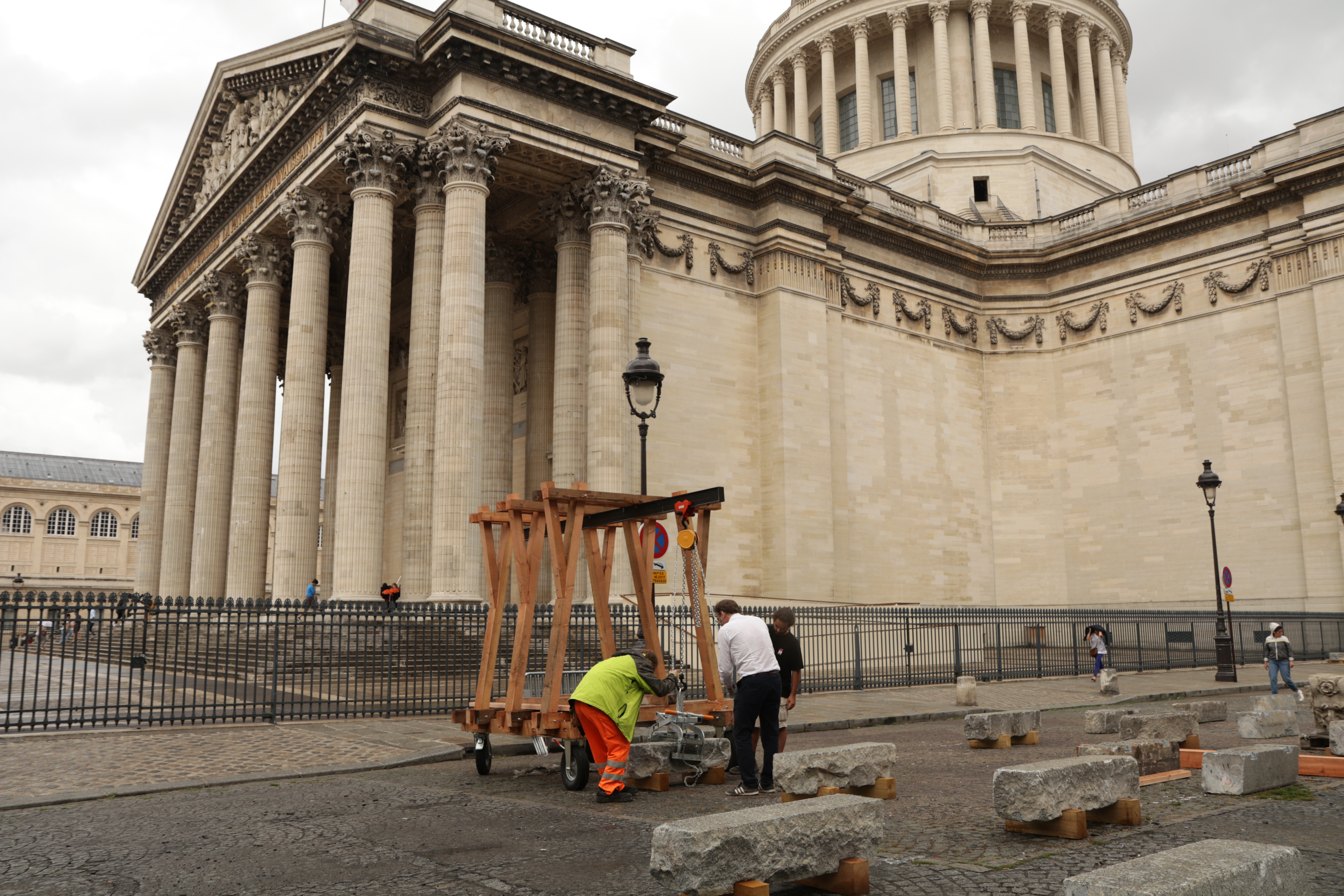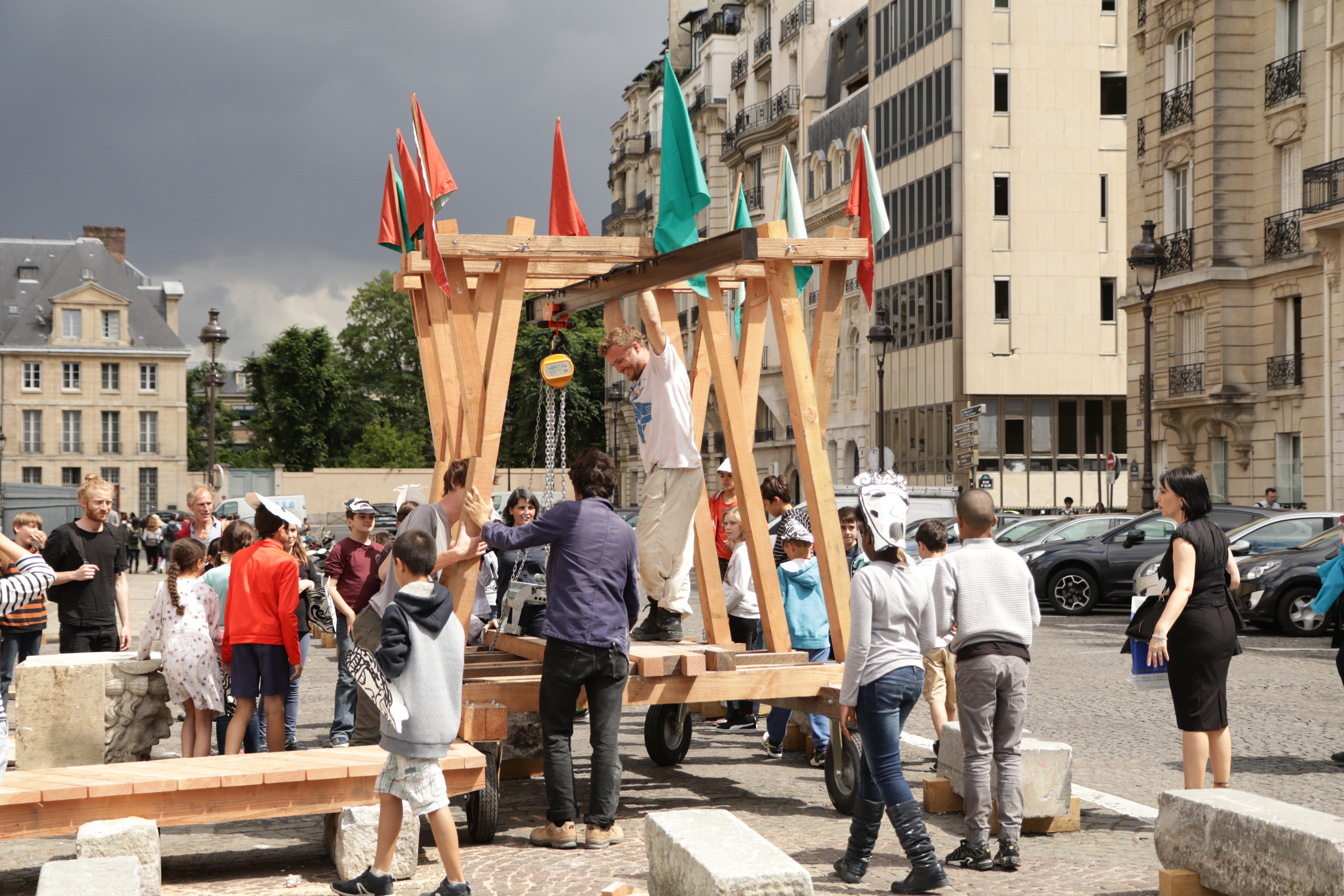 La translateuse se manipule à quelques adultes seulement, son grappin à poulie vient mordre et soulever la pierre et une fois le bloc en suspension, une équipe peut alors pousser l’instrument de bois pour opérer la translation du module sur la place. Celle-ci sera présentée en action durant des ateliers menés avec les écoles du quartier.